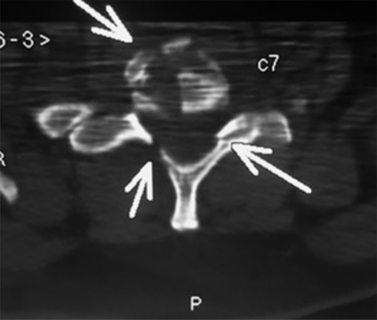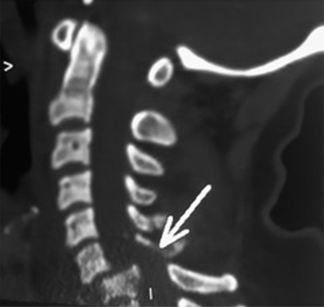 Paciente femenino de 46 años, se presenta en la sala de urgencias con politrauma secundario a accidente automovilístico. A su ingreso refería disnea, dolor de extremidades superiores e inferiores izquierdas y dolor cervical. A la exploración física se encontraba con inmovilización cervical con collarín rígido, saturación de oxígeno de 94% con mascarilla reservorio 10 L/min, presión arterial 74/52 mmHg, frecuencia cardíaca de 52 latidos por minuto, 18 respiraciones por minuto, Glasgow 15/15 con un peso de 88 kilogramos y estatura 1.54 metros (índice de masa corporal de 37.13). En el abordaje radiológico, la tomografía axial computarizada reveló una fractura multifragmentada de cuerpo vertebral de C7 con desplazamiento posterior cercano a 50% con disminución de la amplitud del conducto raquídeo (Figuras 1 y 2). Otros diagnósticos integrados fueron contusiones en hemitórax izquierdo, fracturas de tibia y peroné izquierdas y luxación de codo izquierdo.