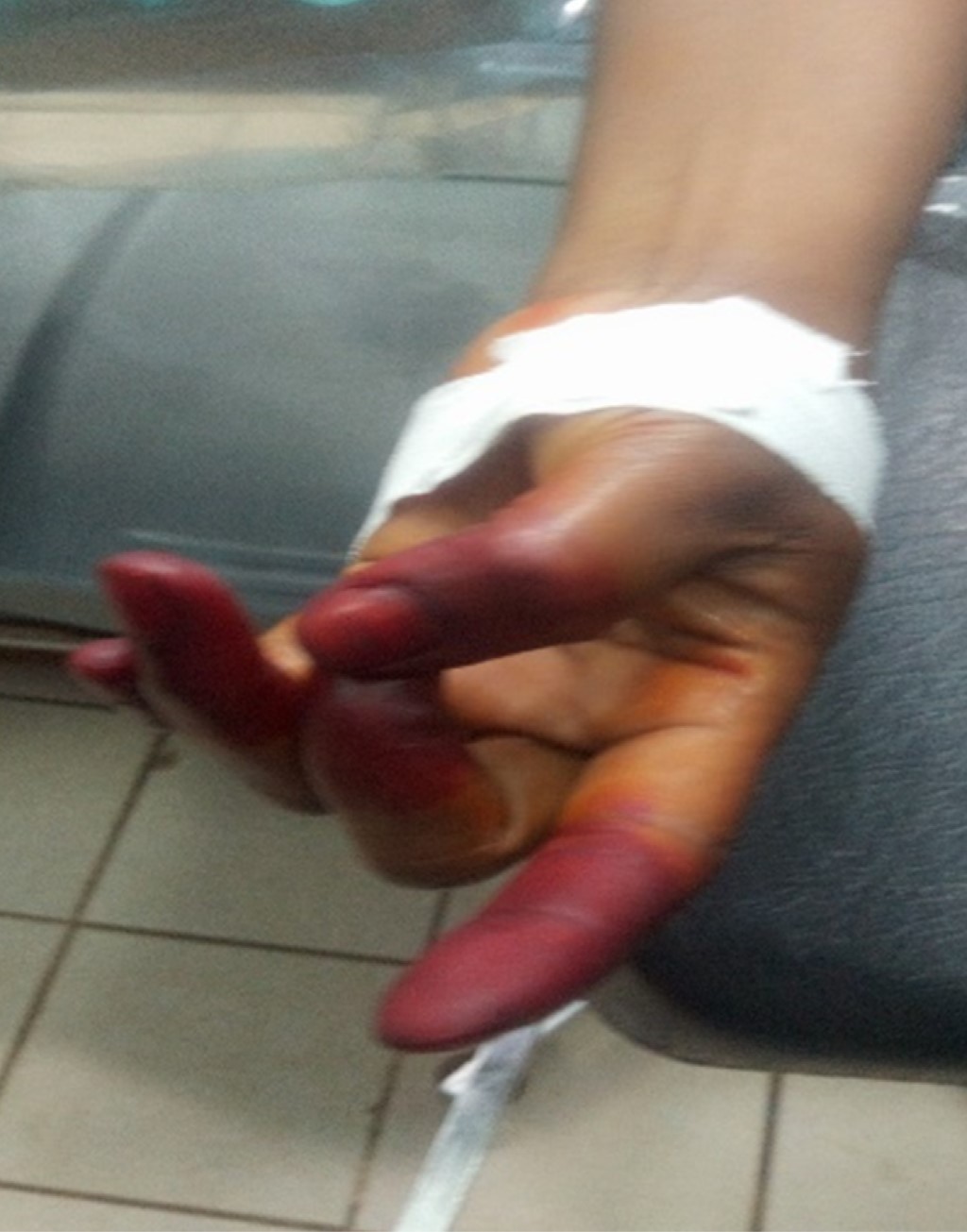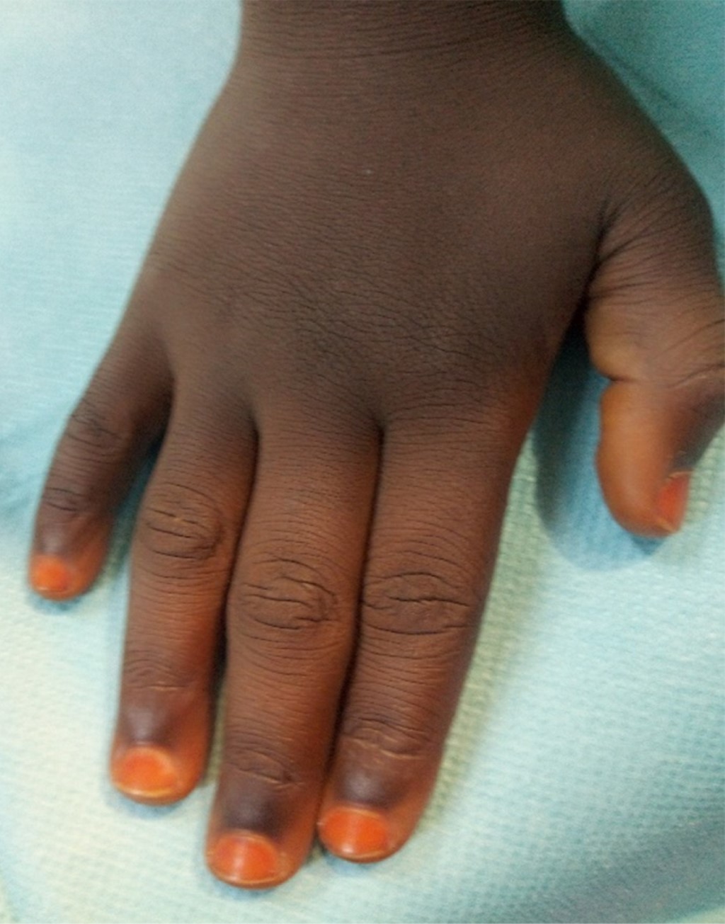 El segundo caso se trata de paciente femenino de 16 años de edad, sin antecedentes patológicos personales, con diagnóstico preoperatorio de hernia epigástrica gigante y con operación propuesta de herniorrafia. Exploración física: aparato respiratorio: normal. Aparato cardiovascular: ruidos cardíacos rítmicos, de buen tono. FC: 94 LPM. TANI: 110/70 mmHg. Valoración de la vía respiratoria: Mallampati-II, distancia tiromentoniana > 6 cm, apertura bucal mayor de 3 cm. Cuello sin alteraciones. Tráquea móvil y central. Ambas manos y pies: uñas de todos los dedos pintadas de un colorante rojo oscuro de Alkanna tinctoria o la alcachofa del tintorero o alkanet (phudan), de carácter no permanente; la paciente se niega a retirar el esmalte a pesar de las múltiples explicaciones a ella y a su mamá sobre la importancia de la monitorización, teniendo en cuenta que en nuestro quirófano sólo contamos con sensores de oxímetros para los dedos, pues alegaba constituye símbolo de buena suerte. Monitorización: cardiovascular: en derivación DII ritmo sinusal; tensión arterial no invasiva: 110/70 mmHg. Saturación parcial de oxígeno (SpO2): 94%. Sin y con suplemento de oxígeno por mascarilla facial a 2 litros por minuto; se insiste por parte del equipo de anestesia sobre la necesidad de retirar el esmalte de una uña de la mano, logrando el consentimiento y consiguiendo inmediatamente valores de 98 a 99%. Posteriormente, todo el procedimiento se realizó sin complicaciones y se mantuvo la SpO2 estable. Anestesia aplicada: general con máscara laríngea. Resultados satisfactorios. Sin complicaciones transoperatorias.