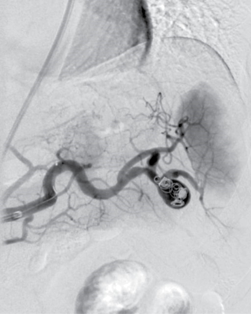 Siendo una paciente que presentaba sintomatología asociada a la patología, se decide iniciar tratamiento de la manera menos invasiva, realizando embolización selectiva y colocación de coils por el Servicio de Angiología, no obstante, presenta una evolución postquirúrgica tórpida, requiriendo nueva angiotomografía, en la cual se visualiza una extensa zona compatible con infarto, al presentar una pobre respuesta al tratamiento de mínima invasión se decide llevar a cabo un tratamiento más invasivo y se programa para esplenectomía y colecistectomía convencional. La literatura refiere como siguiente paso en el tratamiento de esta paciente una intervención laparoscópica secundaria a la falla del tratamiento de mínima invasión, sin embargo, no se contaba con el recurso de laparoscopia en ese momento en nuestra unidad, por lo que se realizó el tratamiento mediante cirugía abierta o convencional.