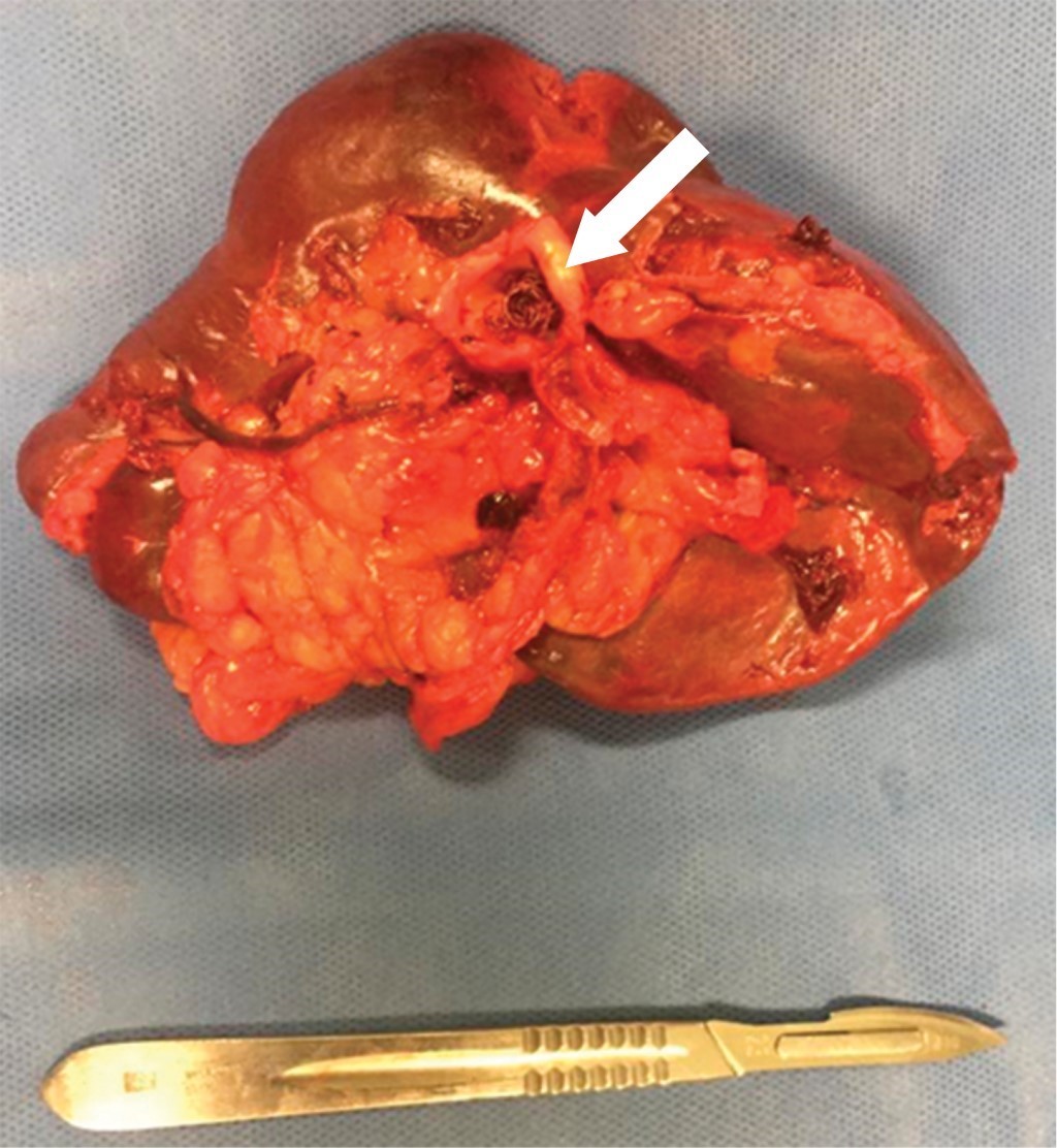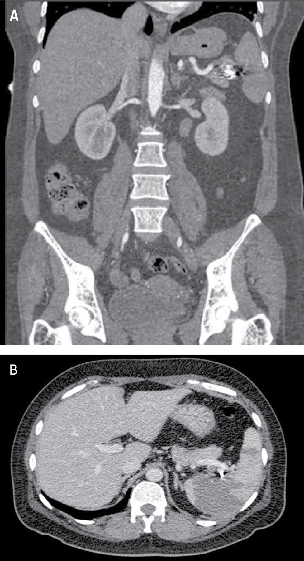 Femenino de 41 años, con antecedente de hipotiroidismo diagnosticado a los 21 años, actualmente sin tratamiento médico desde los 40 años por aparente control, diagnóstico de miomatosis uterina a los 40 años, sin tratamiento; antecedente de dos cesáreas, última a los 23 años, sin complicaciones. Accidente automovilístico con volcadura a los 40 años, sin daño orgánico aparente. Inicia padecimiento actual posterior a accidente automovilístico ocurrido un año previo con dolor en hipocondrio izquierdo, de tipo intermitente, punzante, sin irradiaciones, sin agravantes ni atenuantes; a la exploración física presenta dolor en hipocondrio izquierdo a la palpación profunda, resto sin datos patológicos. Se realizó ultrasonido con hallazgos compatibles con aneurisma de la arteria esplénica y colelitiasis, se complementa abordaje diagnóstico con angiotomografía de aorta abdominal encontrando arteria esplénica de calibre normal, con dilatación focal sacular en segmento distal compatible con aneurisma de 17.7 × 15.9 mm y cuello de 5.5 mm, con trombo mural de 2 mm, sin signos de ruptura, litiasis vesicular y miomatosis uterina. En manejo conjunto con angiología se realiza embolización selectiva con colocación de coils, sin complicaciones aparentes (Figura 1). En el seguimiento inmediato, la paciente presenta dolor abdominal y leucocitosis, se realiza nueva angiotomografía con datos sugestivos de oclusión de arteria esplénica e infarto esplénico (Figura 2). Por los hallazgos comentados se decide realizar esplenectomía y colecistectomía convencional mediante abordaje quirúrgico con incisión en línea media, supraumbilical, con los siguientes hallazgos: vesícula biliar de paredes delgadas, múltiples litos en su interior de 5-10 mm aproximadamente, arteria cística de 2 mm, conducto cístico de 3 mm, bazo de 13 × 10 cm aproximadamente, con múltiples zonas isquémicas, aneurisma de la arteria esplénica a nivel de hilio esplénico, posterior a su bifurcación (Figura 3). Cursa el postoperatorio sin complicaciones, por lo que fue egresada tres días después de la cirugía, recibió vacunación correspondiente para pacientes esplenectomizados. Reporte histopatológico con hallazgos de aneurisma de arteria esplénica con ateroesclerosis, parénquima esplénico con vasos congestivos y colecistitis crónica litiásica.