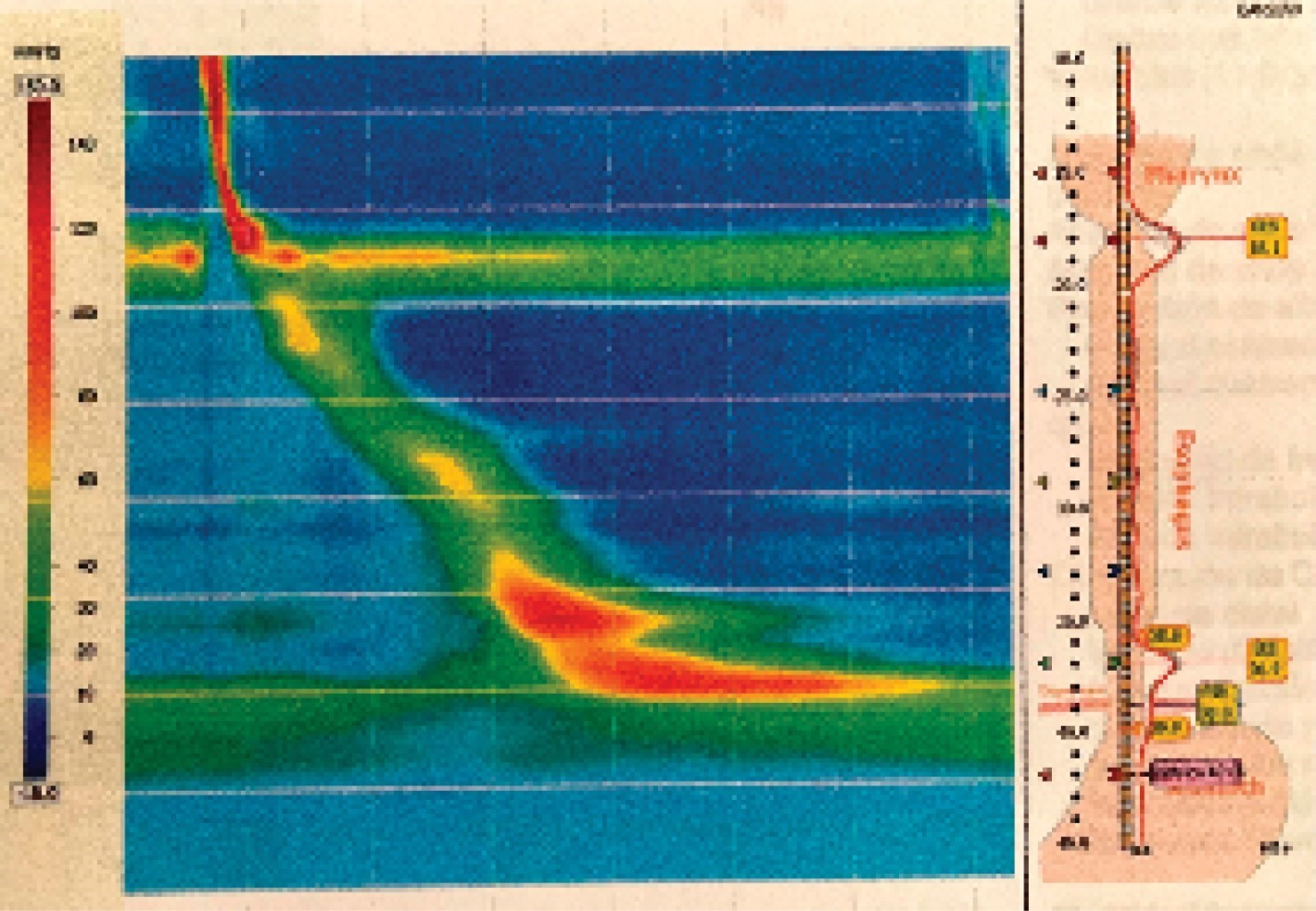 La manometría reporta esfínter esofágico superior de tono normal y relajación completa, motilidad esofágica efectiva, unión esofagogástrica tipo 1, con esfínter esofágico inferior con presión basal promedio normal, relajación de la unión esofagogástrica normal (Figura 3).