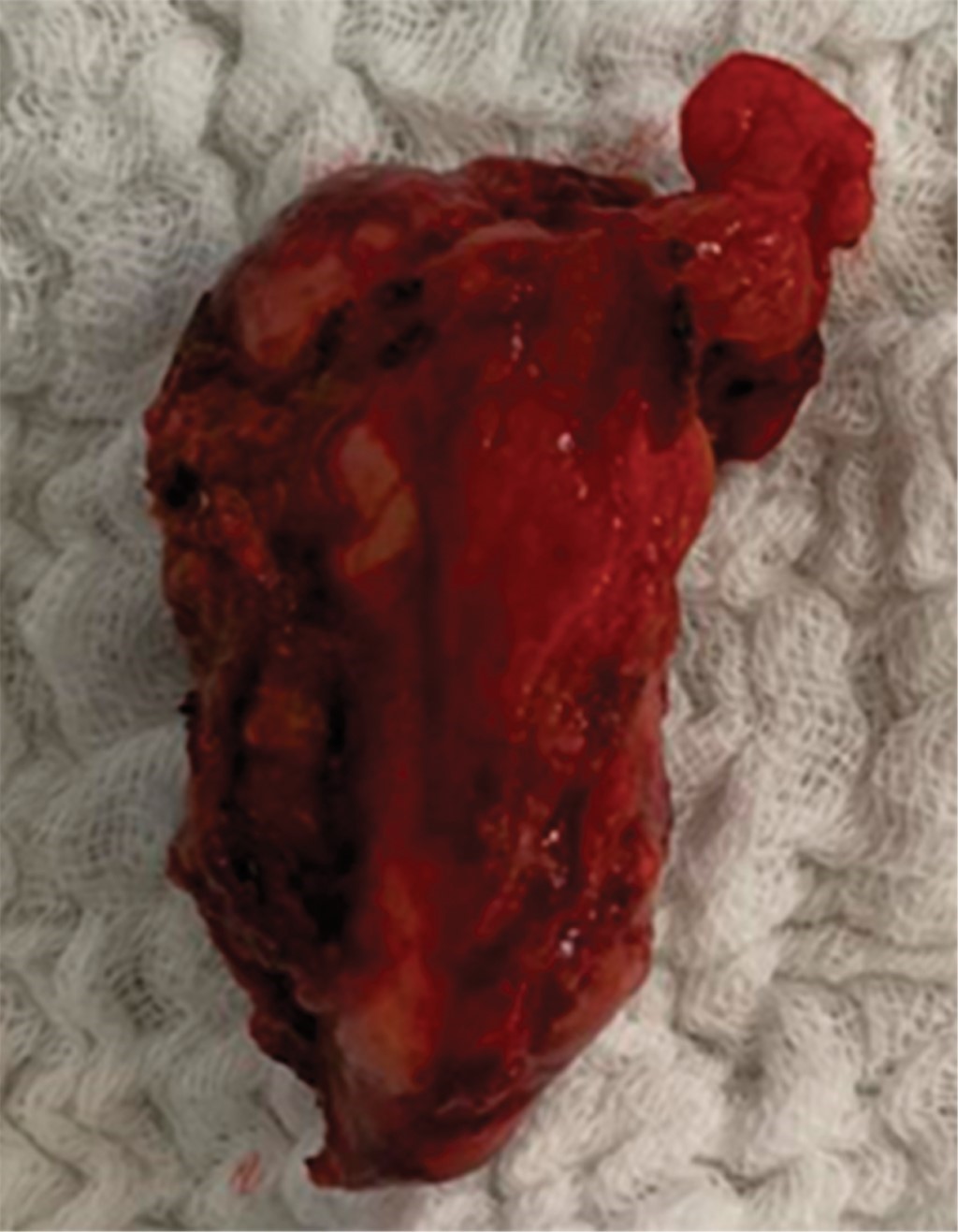 Al examen físico paciente consciente, orientado, a su ingreso los signos vitales: frecuencia cardiaca en 92 por minuto, tensión arterial de 102/80 mmHg, saturación de oxígeno 94% con FiO2 de 36%. El abdomen se observa distendido con ruidos hidroaéreos disminuidos y a la palpación se evidencia resistencia muscular involuntaria con signo de Dunphy positivo. Se realizan exámenes de laboratorio e imagen con los siguientes resultados: leucocitos: 14.7 K/μl, neutrófilos: 77.7%, hemoglobina: 11.1 g/dl, hematocrito: 33.8%, plaquetas: 236,000 K/μl, gasometría arterial al ingreso con pH: 7.11, pCO2: 36 mmHg, PO2: 60 mmHg, HCO3: 11.40 mEq/l, EB: -17.20 mEq/l, lactato: 9.70 mmol/l. Se decide reanimación con cristaloides y realizar una tomografía computarizada (TC) de abdomen sin contraste que reporta hígado con densidad tomográfico heterogéneo de aspecto micronodular, con disminución de tamaño del lóbulo derecho, hallazgos en probable relación con cirrosis hepática. Además, presencia de líquido perihepático, periesplénico, correderas parietocólicas y hueco pélvico en un volumen aproximado de 1,500 cm3 (Figura 1). Posteriormente, el paciente refiere de nuevo sensación de debilidad con signos vitales: frecuencia cardiaca: 115 por minuto, tensión arterial: 80/50 mmHg, por lo cual se decide trasladarlo a sala de operaciones de forma urgente, se inicia de forma laparoscópica, pero por los hallazgos se decide en el transquirúrgico la conversión a laparotomía donde se identifican 2,000 ml de hemoperitoneo, masa de 4 × 5 cm aproximadamente en segmento II del hígado con sangrado activo, se realiza drenaje de hemoperitoneo y segmentectomía hepática del segmento II (Figura 2), en el transquirúrgico se transfunden dos paquetes de glóbulos rojos, el paciente pasa a sala general con estabilidad hemodinámica; sin embargo, en el control de exámenes la hemoglobina se encuentra en 8.5 g/dl, por lo que se decide pasar dos paquetes más de glóbulos rojos y dos de plasma fresco congelado, posterior a esto su evolución fue sin complicaciones, se retira drenaje de Jackson Pratt y al cuarto día de hospitalización se da el alta médica con paracetamol vía oral 1 gramo cada ocho horas por cinco días.