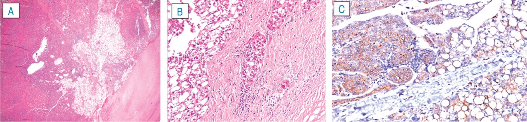 El reporte de histopatología del segmento II de hígado concluye como carcinoma hepatocelular con proliferación de células dispuestas en patrón mixto (trabecular, acinar y de células claras) con invasión de la cápsula (Figura 3), pero con bordes libres, por lo cual se interconsulta a oncología clínica para su seguimiento y tratamiento complementario.