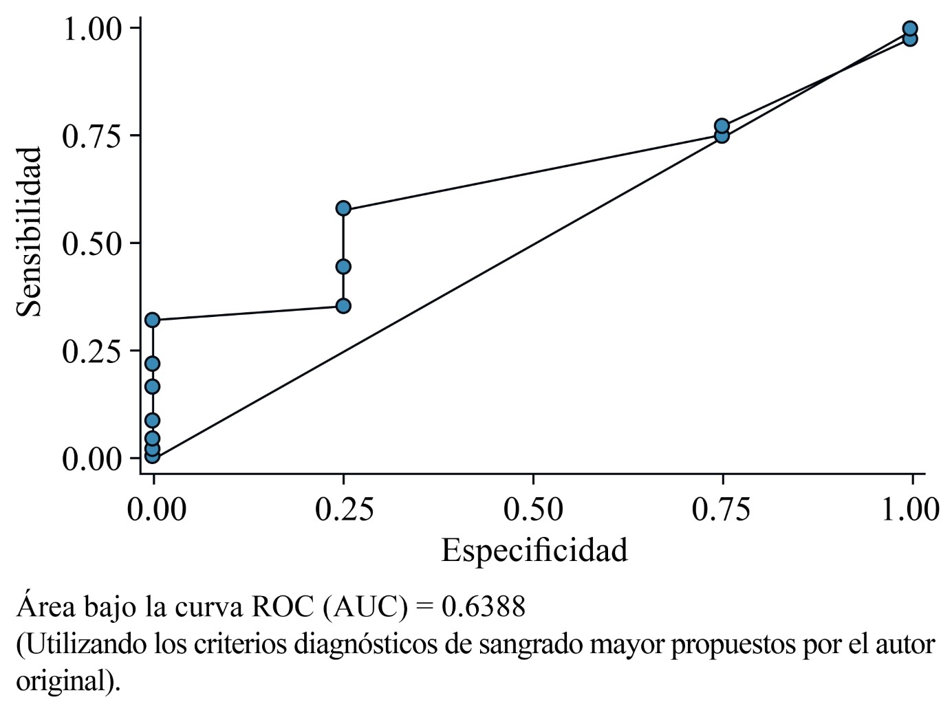 El área bajo la curva (AUC, por sus siglas en inglés) de la escala IMPROVE modificada (Figura 1) para este desenlace fue de 0.6388 (IC 95% 0.41-0.87), lo cual indica una baja capacidad discriminatoria de la escala. Con un índice de Youden de 0.33; el mejor punto de corte se encuentra en 2.75 puntos con una sensibilidad de 58%, una especificidad de 75% y un AUC de 0.67. El modelo presenta buena calibración probada con la prueba de Hosmer-Lemeshow y se pudo observar que para el punto de corte de 7 puntos sugerido por los autores existe una probabilidad de 99.48% de presentar un evento de sangrado mayor. Además, se observa un posible segundo punto de corte en 4 puntos, representando una probabilidad de 97.80% de presentar el evento.