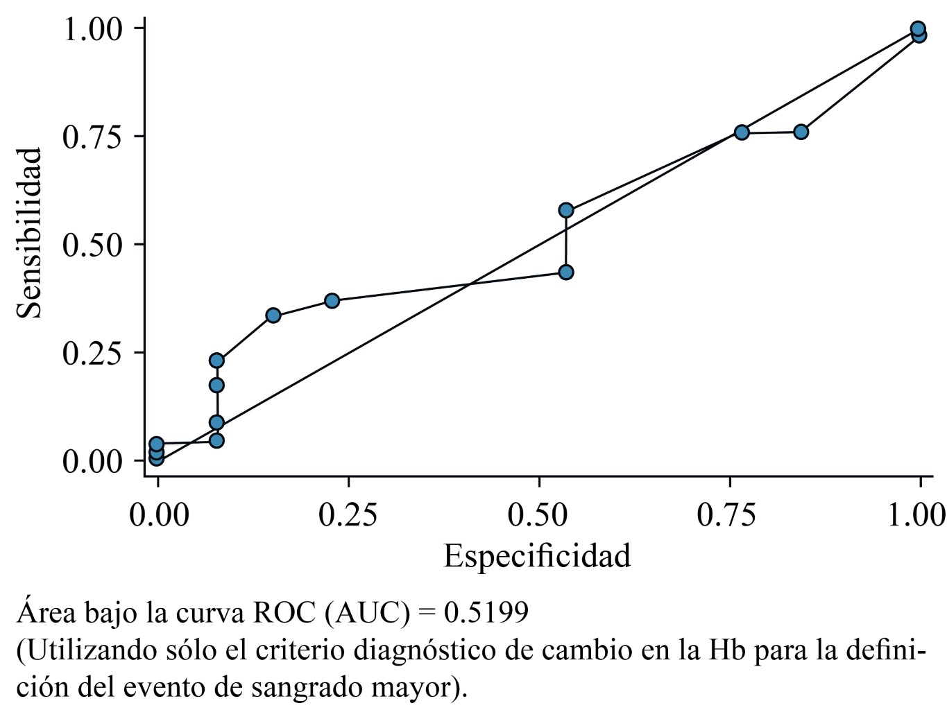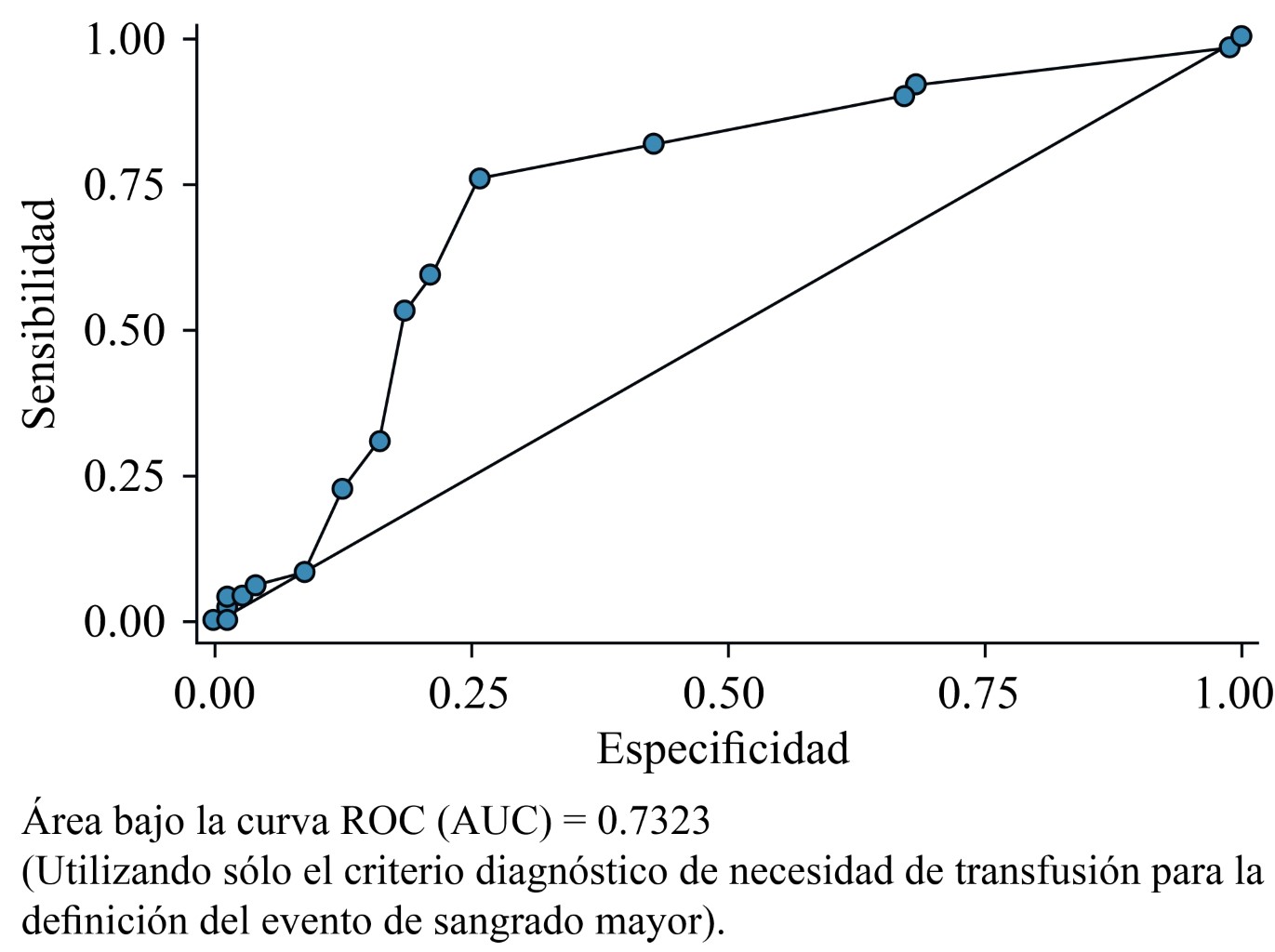 Asimismo, se calcularon los valores de sensibilidad, especificidad y valores predictivos de la escala IMPROVE modificada para la población estudiada. Para poder evaluar la sensibilidad de la escala en diferentes puntos de corte se realizó un análisis multivariado para la construcción de una curva ROC, calculándose sus intervalos de confianza al 95% y el índice de Youden. Se probaron tres modelos diferentes: 1) un modelo crudo en el que se consideraron ambos criterios para el diagnóstico de sangrado mayor, 2) uno en el que sólo se tomó en cuenta el criterio de cambio en la hemoglobina (Hb) para la definición del desenlace de sangrado mayor y 3) uno en el que sólo se tomó en cuenta el criterio de la necesidad de transfusión de dos paquetes para la definición del mismo desenlace. Para la calibración de los modelos se utilizó la prueba de Hosmer-Lemeshow para bondad de ajuste.