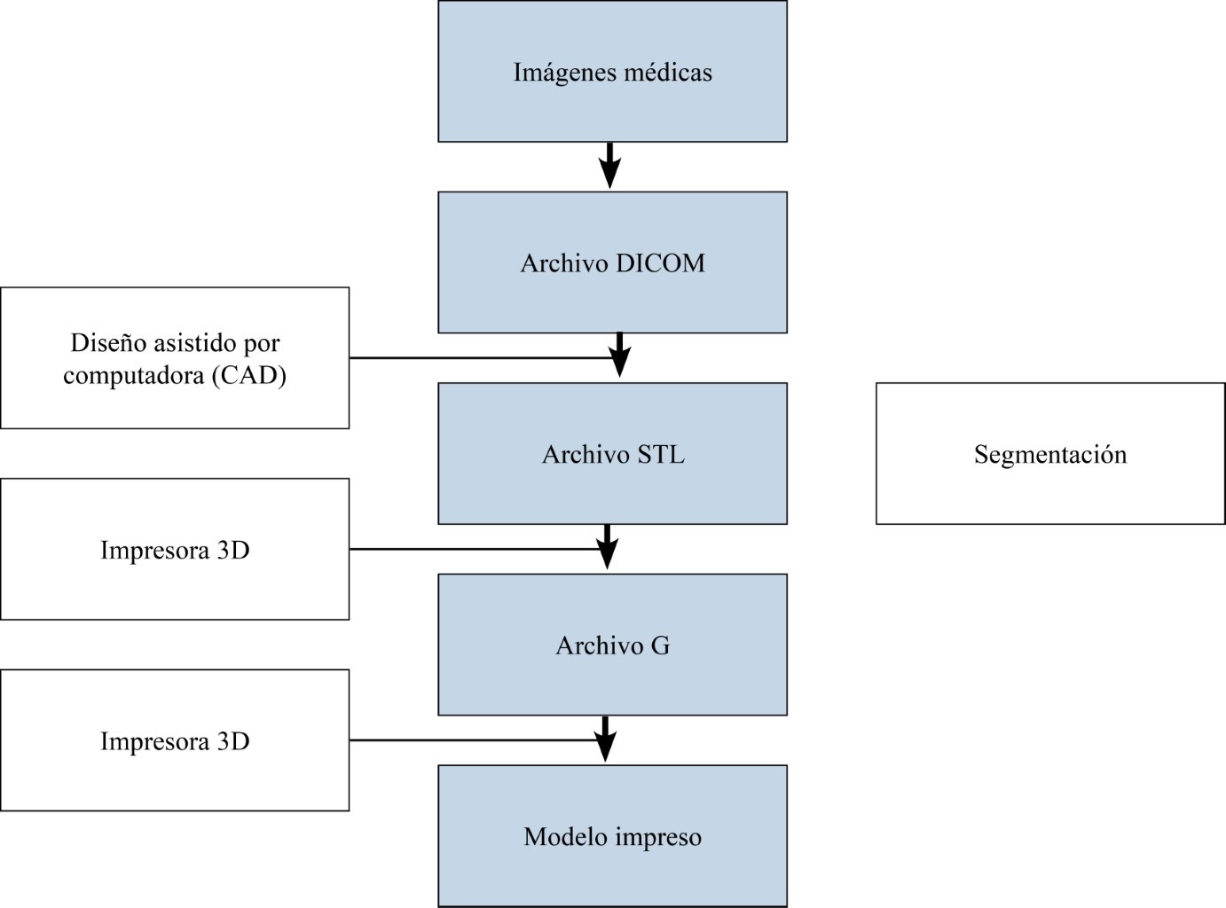 - 1. Generación de las imágenes: el primer paso es la generación de las imágenes. Las mismas deberán cumplir requisitos mínimos de resolución y grosor de los cortes para poder ser procesadas. En el campo de la ortopedia y traumatología habitualmente se utilizan los estudios de tomografía computada, potencialmente también podrían utilizarse las imágenes de resonancia magnética, aunque tienen menos resolución.2