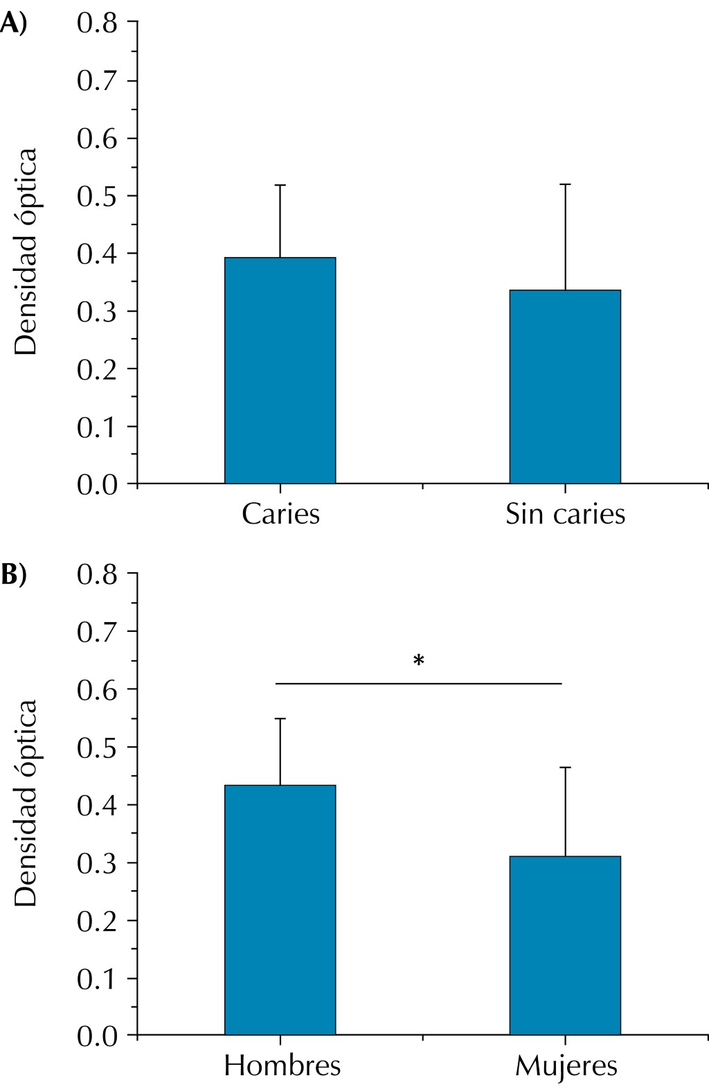 El crecimiento inicial bacteriano se evaluó mediante densidad óptica, no hubo diferencias estadísticamente significativas entre los pacientes que presentaron caries y los que no (Figura 1A). Sin embargo, se encontraron diferencias estadísticamente significativas entre hombres y mujeres, lo cual apunta a una tendencia en la que los hombres presentan mayor resistencia bacteriana comparado con las mujeres (Figura 1B).