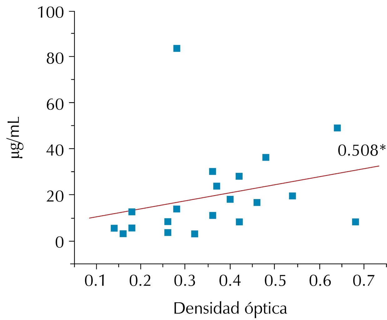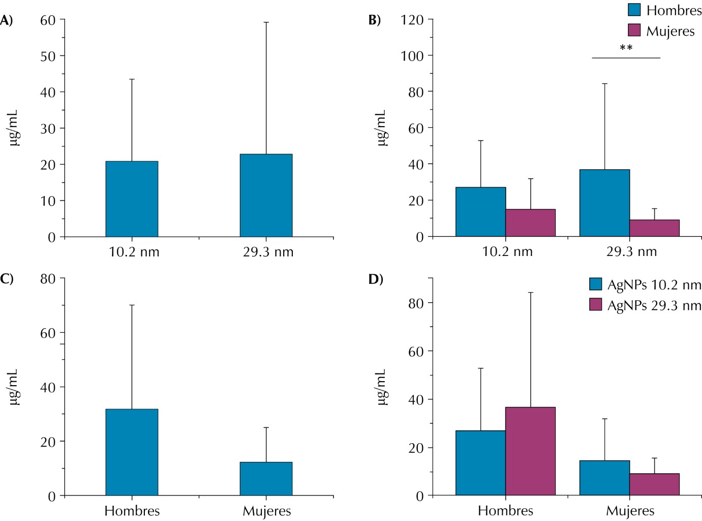 Se evaluó el crecimiento bacteriano entre los dos tamaños de AgNPs (10.2 nm y 29.3 nm) y a pesar de que las AgNPs grandes (29.3 nm) mostraron mayor resistencia antimicrobiana, no hubo diferencias significativas (Figura 2A), a su vez se compararon los dos tamaños de nanopartículas con respecto al sexo, las AgNPs de menor tamaño (10.2 nm) no evidenciaron diferencias estadísticamente significativas entre los pacientes hombres y mujeres, sin embargo, los microorganismos presentes en las muestras de los pacientes hombres mostraron una diferencia estadísticamente significativa en cuanto a la resistencia a las AgNPs más grandes (29.3 nm) (Figura 2B). Además, se encontró una correlación positiva significativa (0.000, p < 0.05) en cuanto a la concentración de tratamiento con la velocidad de crecimiento bacteriano (Figura 3).