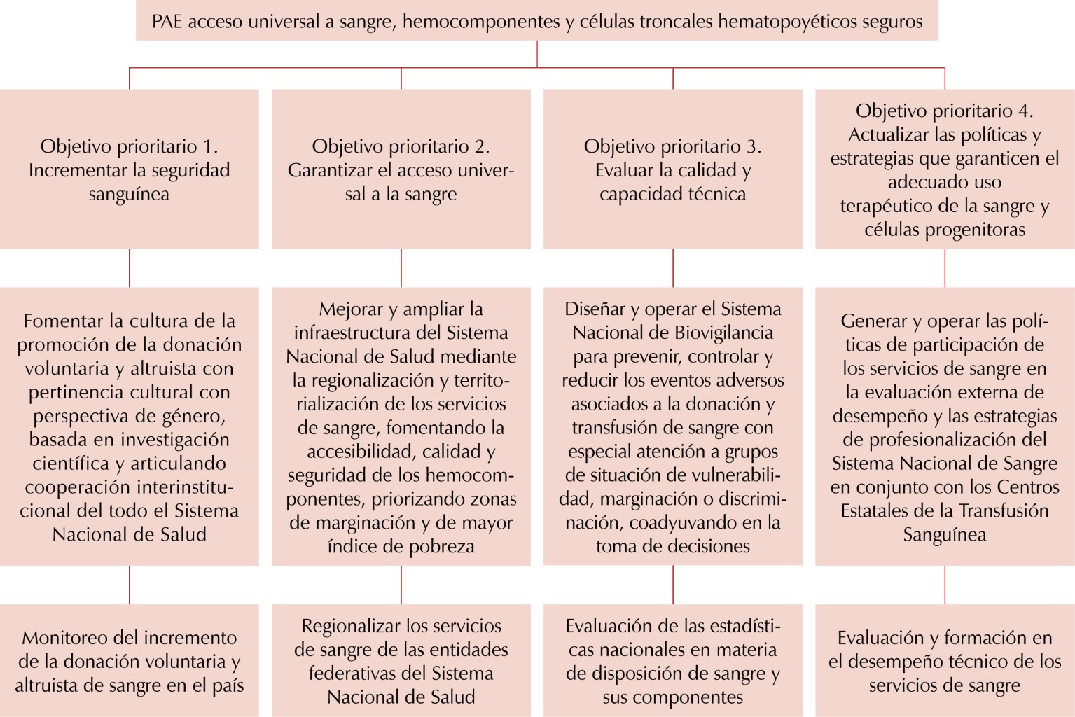 En México, la política de transfusión sanguínea tiene su fundamento normativo en la Constitución Política de los Estados Unidos Mexicanos, que establece en su artículo 4°, que "toda persona tiene derecho a la protección de la salud"; en la Ley General de Salud, cuyo artículo 313, fracción III, menciona que compete a la Secretaría de Salud (SS) establecer y dirigir las políticas en salud en materia de donación y transfusión de sangre, componentes sanguíneos y células, para lo cual se apoyará en el Centro Nacional de la Transfusión Sanguínea (CNTS) y, en el artículo 340 de la Ley General de Salud, que señala que "el control sanitario de la disposición de la sangre lo ejercerá la SS, por medio de la Comisión Federal para la Protección contra Riesgos Sanitarios (COFEPRIS)". Teniendo como referente el principio dispuesto en el Plan Nacional de Desarrollo: "No dejar a nadie atrás, no dejar a nadie afuera", el Programa de Acción Específico de Acceso universal a sangre, hemocomponentes y células troncales hematopoyéticos seguros 2020-2024 tendrá como objeto implementar los objetivos prioritarios, estrategias prioritarias y acciones puntuales que describe dicho programa (Figura 1).