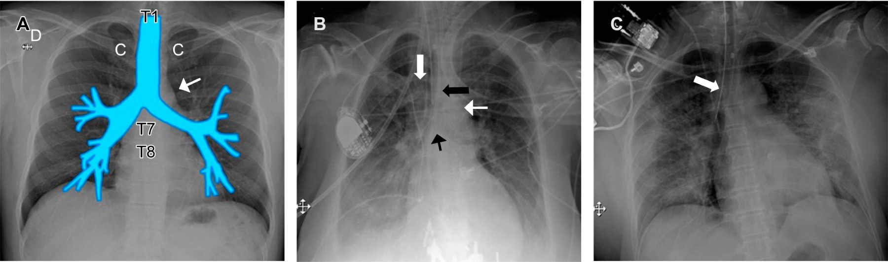 - 1. Intubación selectiva. Si el tubo endotraqueal sobrepasa los marcadores anatómicos antes descritos, existe el riesgo de realizar una intubación bronquial selectiva, generalmente al bronquio principal derecho.3,6 Esto conduce al colapso del pulmón contralateral, e hiperinflación o neumotórax del pulmón ipsilateral (Figura 1C).6