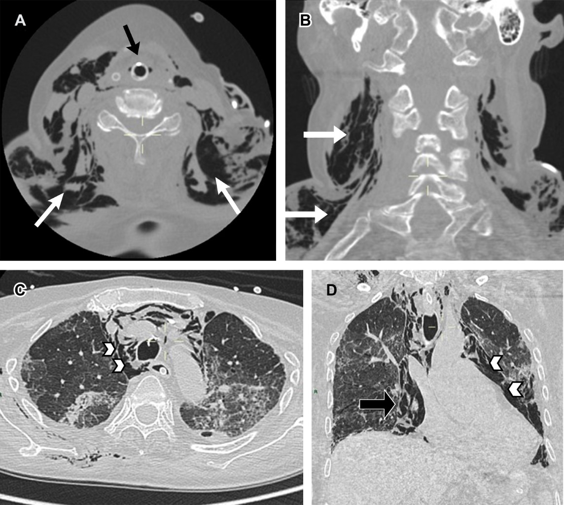 En cuanto a la anatomía, destacamos que la pared posterior de la tráquea es membranosa predisponiéndola al trauma, cuando la lesión se asocia al dispositivo endotraqueal el sitio de lesión más común es éste. Los hallazgos radiológicos incluyen neumotórax bilateral, enfisema subcutáneo masivo (si la lesión involucra la hipofaringe el aire se extiende y diseca la región cervical)1 y neumomediastino (Figura 2).8,14,15