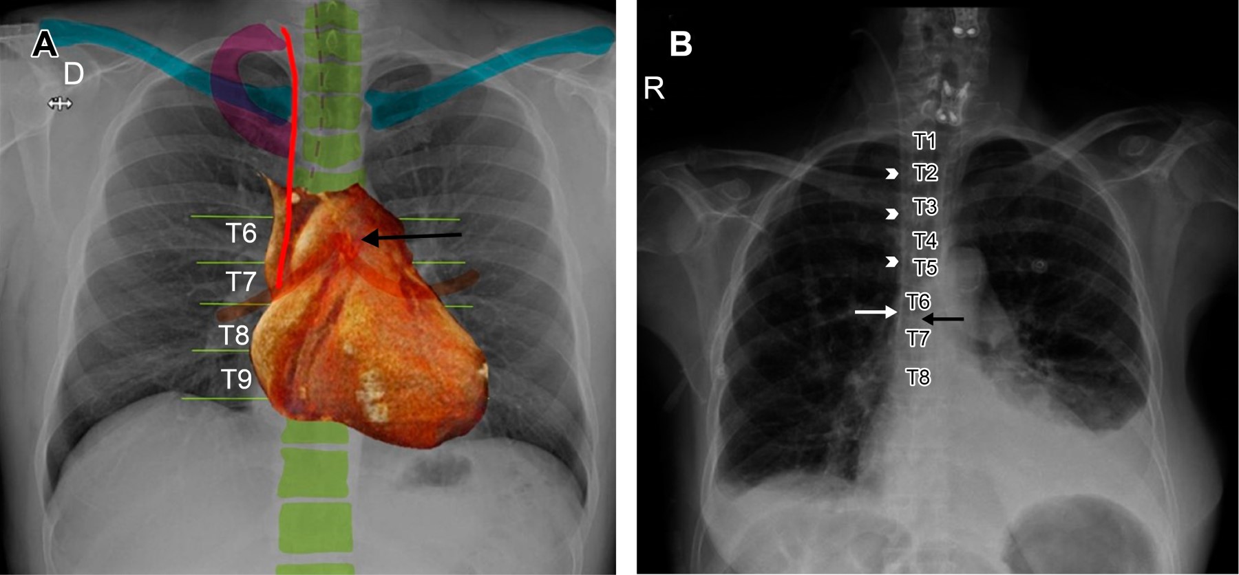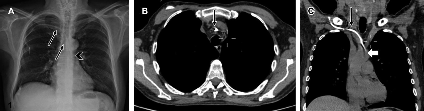 Cuando no se logra identificar la carina, debemos recordar que normalmente se encuentra entre los cuerpos vertebrales T5 y T7 en 95% de los pacientes.1 Existen otros marcadores anatómicos para determinar si el extremo distal del tubo tiene una posición óptima, y podemos usar de referencia los cuerpos vertebrales T2-T4,6,8 los bordes mediales de las clavículas o la porción caudal del arco aórtico (Figura 1A y B).10