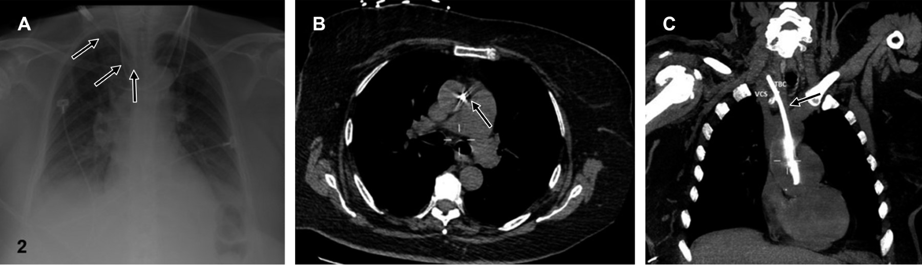 Evaluación radiológica: la evaluación del cateterismo como exitoso, ya sea de acceso yugular o subclavio, debe basarse en el conocimiento de los marcadores anatómicos en la radiografía.3 La identificación inicial del catéter es crucial, y deben tomarse en cuenta los siguientes puntos; el extremo distal del catéter debe localizarse distal a la última válvula venosa que corresponde a la confluencia de ambas venas braquiocefálicas formando la vena cava superior (VCS), que en la placa de tórax se proyecta en el borde interno de la primera costilla y lateral al borde esternal derecho (es valioso comprender que la VCS presenta una estrecha relación con los vasos supraaórticos a este nivel, ya que se localiza anterior a éstos).7,9,18