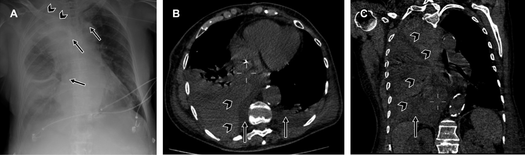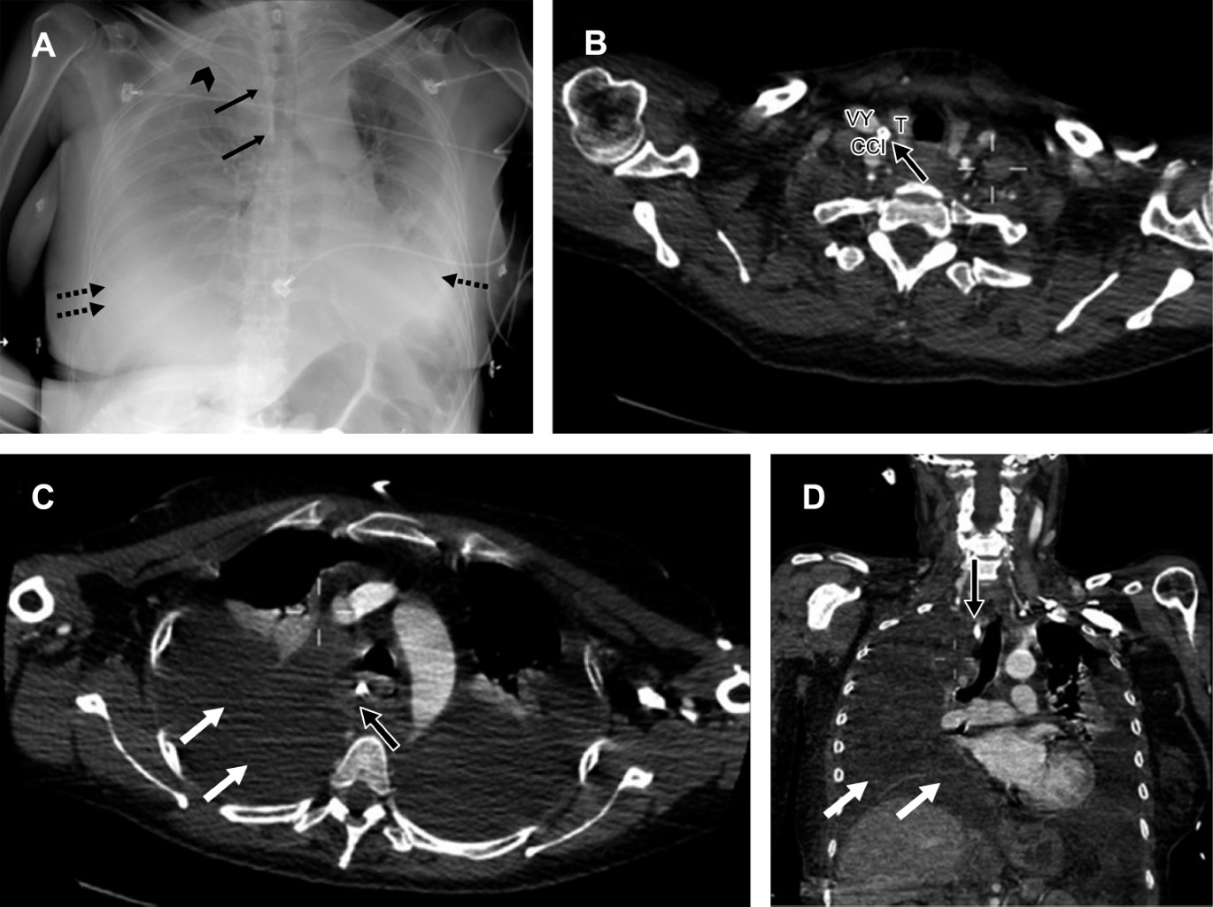 La situación habitual de la vena cava superior está en relación cercana a la pleura mediastínica en el tórax superior, lo que incrementa el riesgo de perforación de la pared vascular con la guía metálica, el dilatador o catéter durante la inserción del dispositivo desencadenando un sangrado de baja presión22 que requerirá intervención quirúrgica. Los estudios de imagen pueden revelar borramiento apical debido a un hematoma extrapleural secundario a la perforación vascular, hemotórax y ensanchamiento mediastinal (Figura 7).3