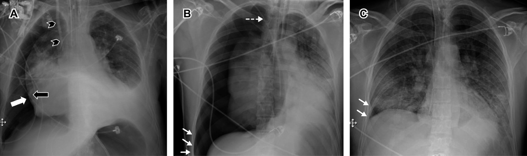Las radiografías de control en este tipo de pacientes por lo regular son anteroposteriores y en decúbito supino, por lo que los datos radiológicos de neumotórax son más difíciles de detectar. Un signo indirecto útil para inferir o sospechar la presencia de un neumotórax en una radiografía tomada con el paciente en decúbito supino es el signo del surco profundo (Figura 8B), donde el ángulo costofrénico lateral se vuelve más profundo y lúcido en comparación con el contralateral.27 Este signo se produce por el aire que se acumula en las partes no dependientes de la pleura (anterior y basal), en contraste con la posición vertical donde el aire se acumula en el ápice.28
