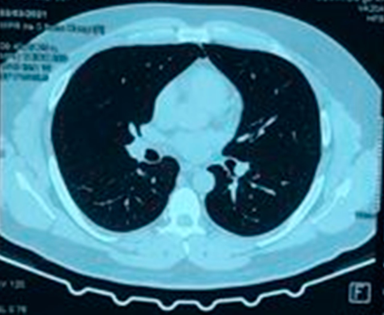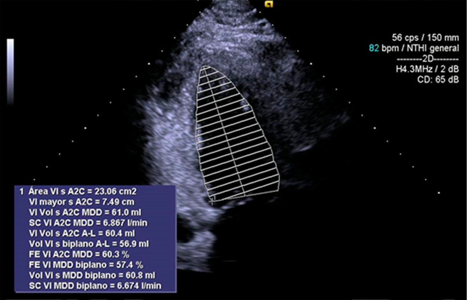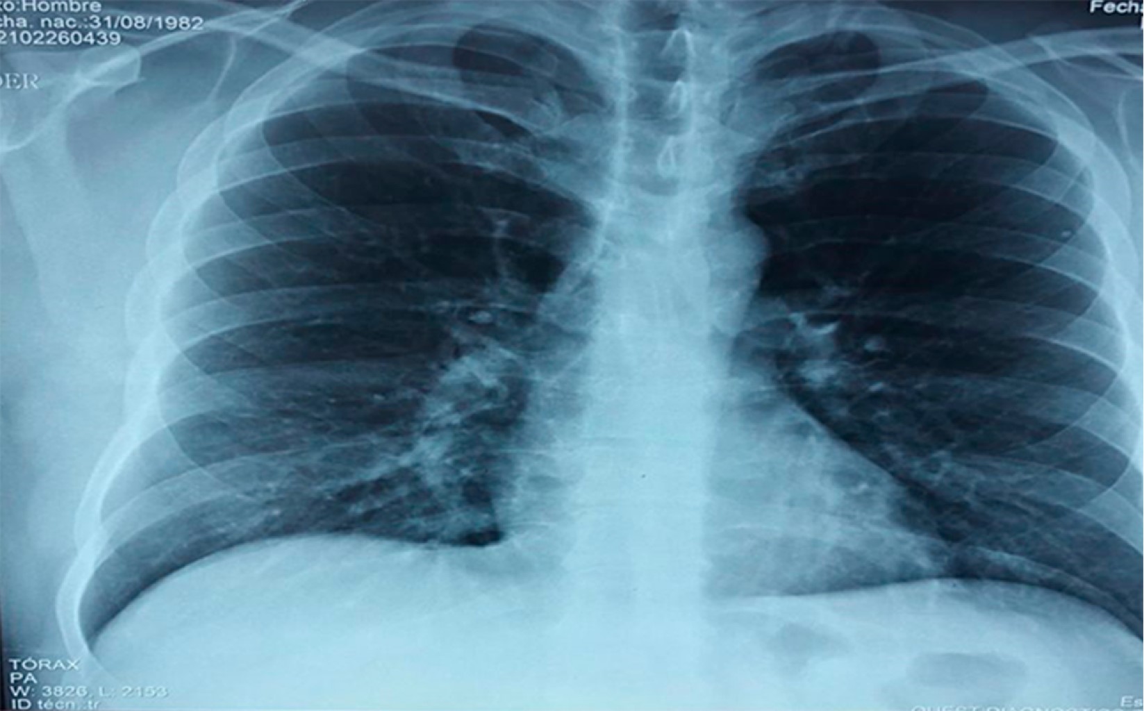 Masculino de 38 años de edad destaca dedicación a la ganadería caprina, sin uso adecuado de equipo de protección personal. Acudió al servicio de urgencias por cuadro clínico de un mes de evolución con presencia de fiebre de predominio nocturno de 39 oC, duración de tres horas, astenia, adinamia, con signos vitales tensión arterial:130/80 mmHg, frecuencia cardiaca:100 lpm, frecuencia respiratoria: 20 rpm, temperatura: 37 oC. A la exploración física sin existencia de adenopatías palpables, sin alteraciones pulmonares ni cardiacas, abdomen sin alteraciones. En la analítica hemoglobina: 17 g/dL, plaquetas: 362 × 109/L, leucocitos: 14.8 × 109/L, neutrófilos: 10.3 × 109/L, PCR SARS-CoV-2 negativa, examen general de orina y urocultivo negativos, IgG Coxiella fase I negativo, IgG Coxiella fase II positivo, IgM fase I Coxiella positivo 1,256 U/mL, IgM fase II Coxiella positivo 116,384 U/ml, radiografía simple de tórax (Figura 1), tomografía simple de tórax (Figura 2). Ecocardiograma transtorácico (Figura 3). Se inició tratamiento con paracetamol 1 gramo intravenoso cada ocho horas y doxiciclina 100 mg vía oral cada 12 horas durante dos semanas (14 días) con mejoría.