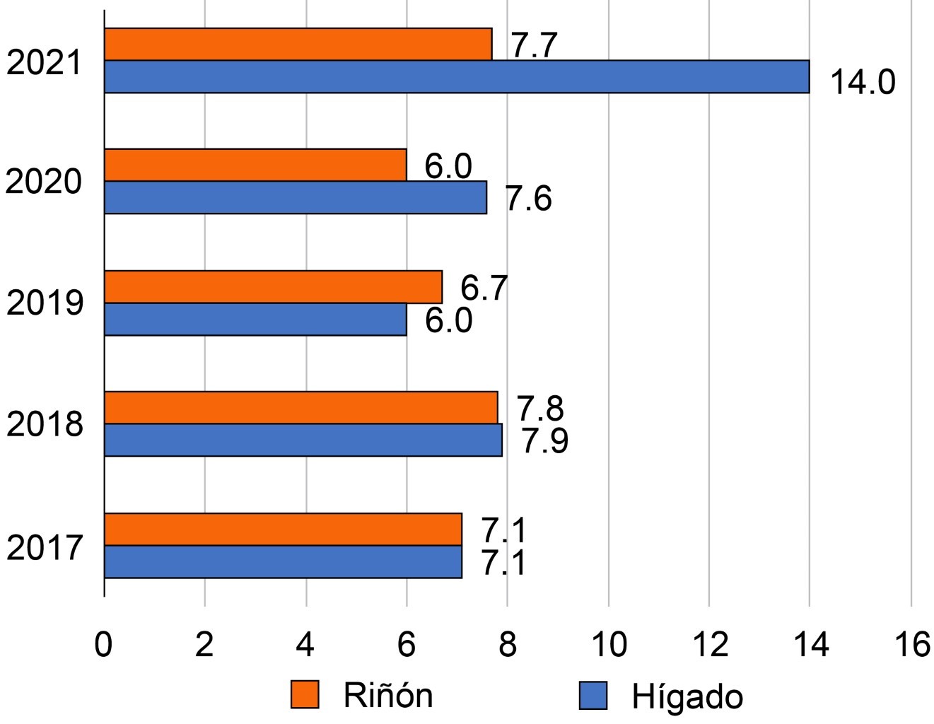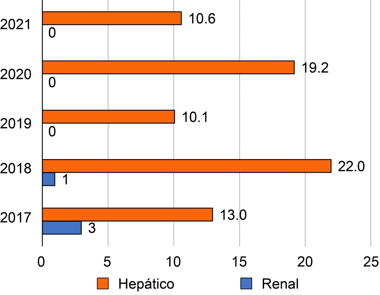 El tiempo promedio de hospitalización fue de 7.2 días para hígado y 6.97 días para riñón. En la Figura 1 se esquematiza la media de días en hospitalización por año y por órgano (hepático y renal). Puede observarse que para riñón la media se ha mantenido estable, en un rango de seis-7.8 días durante los últimos cinco años, mientras que para hígado hubo un incremento importante en 2021 (2020 = 7.6 días, 2021 = 14 días) debido a un paciente que presentó complicaciones postquirúrgicas y que permaneció hospitalizado por 25 días. Durante el periodo estudiado no ocurrió ninguna defunción en el postoperatorio ni durante la estancia hospitalaria postrasplante, lo que refleja que se han estado manejando estancias hospitalarias y cuidados perioperatorios adecuados.