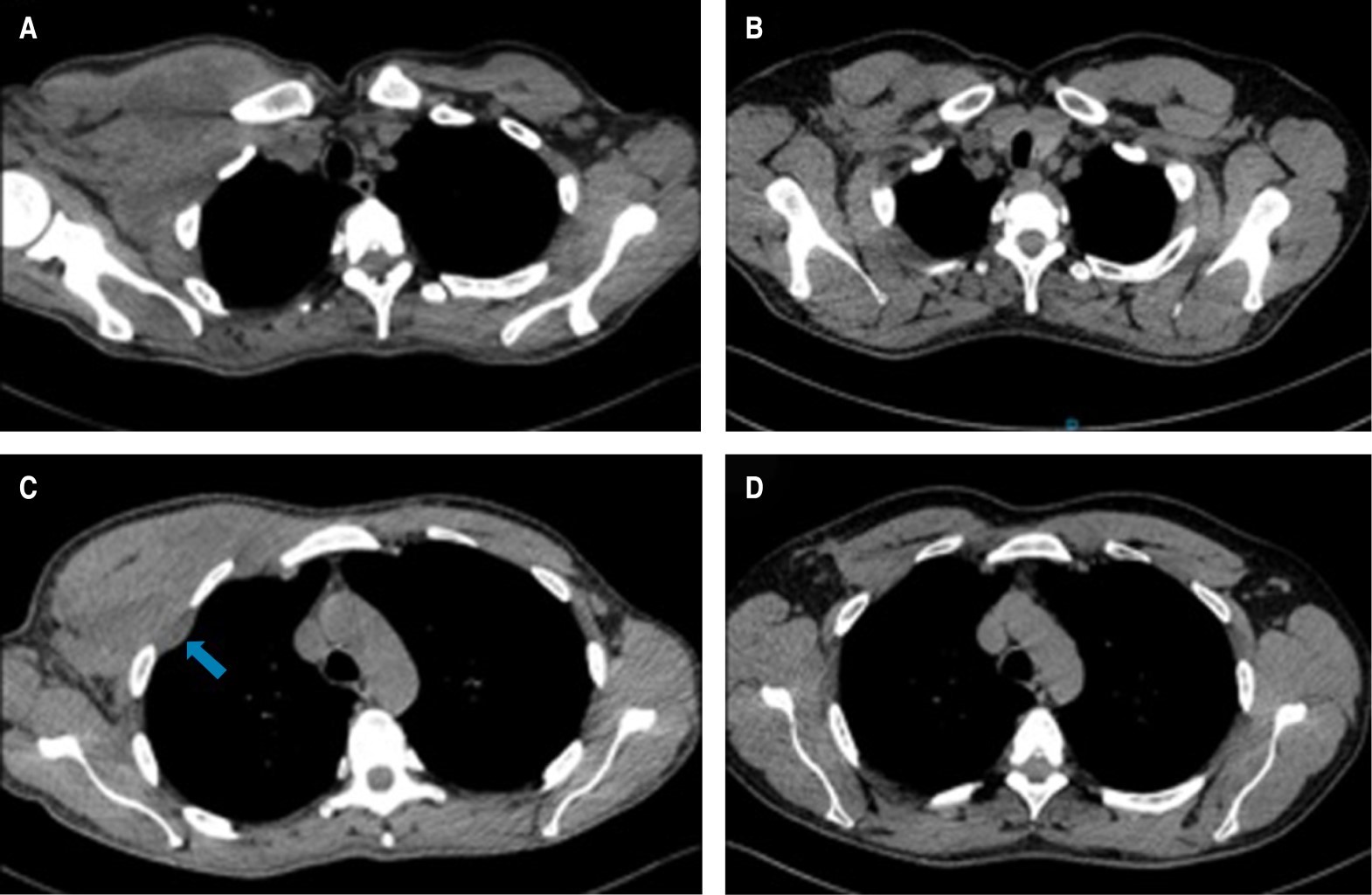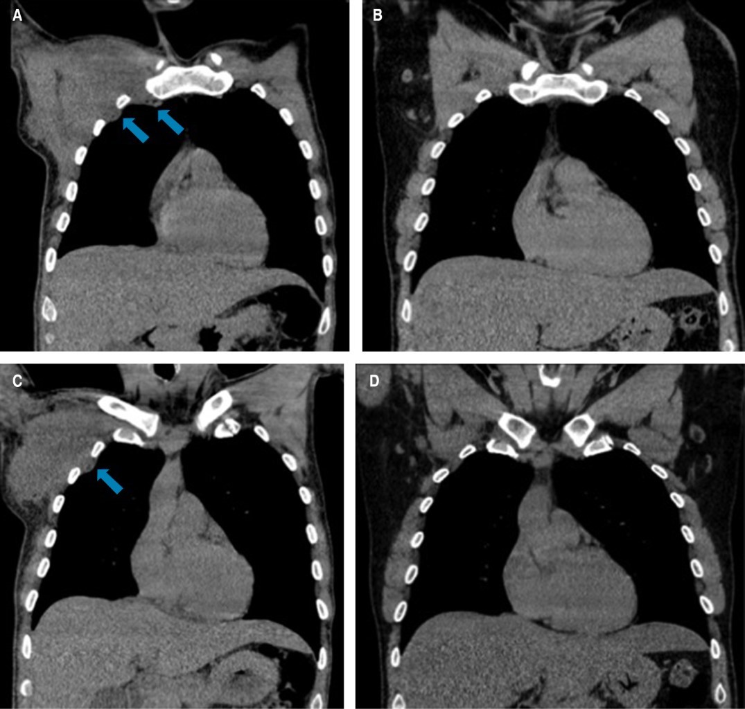 Un mes después del inicio de los síntomas, el paciente acude a consulta refiriendo reducción de la tumoración de forma espontánea, donde a la exploración física no se observa ni se delimitan masas a la palpación, por lo que se realiza tomografía de tórax en diferentes cortes donde no se observan remanentes de la tumoración torácica o de las linfadenopatías (Figuras 1 y 2).