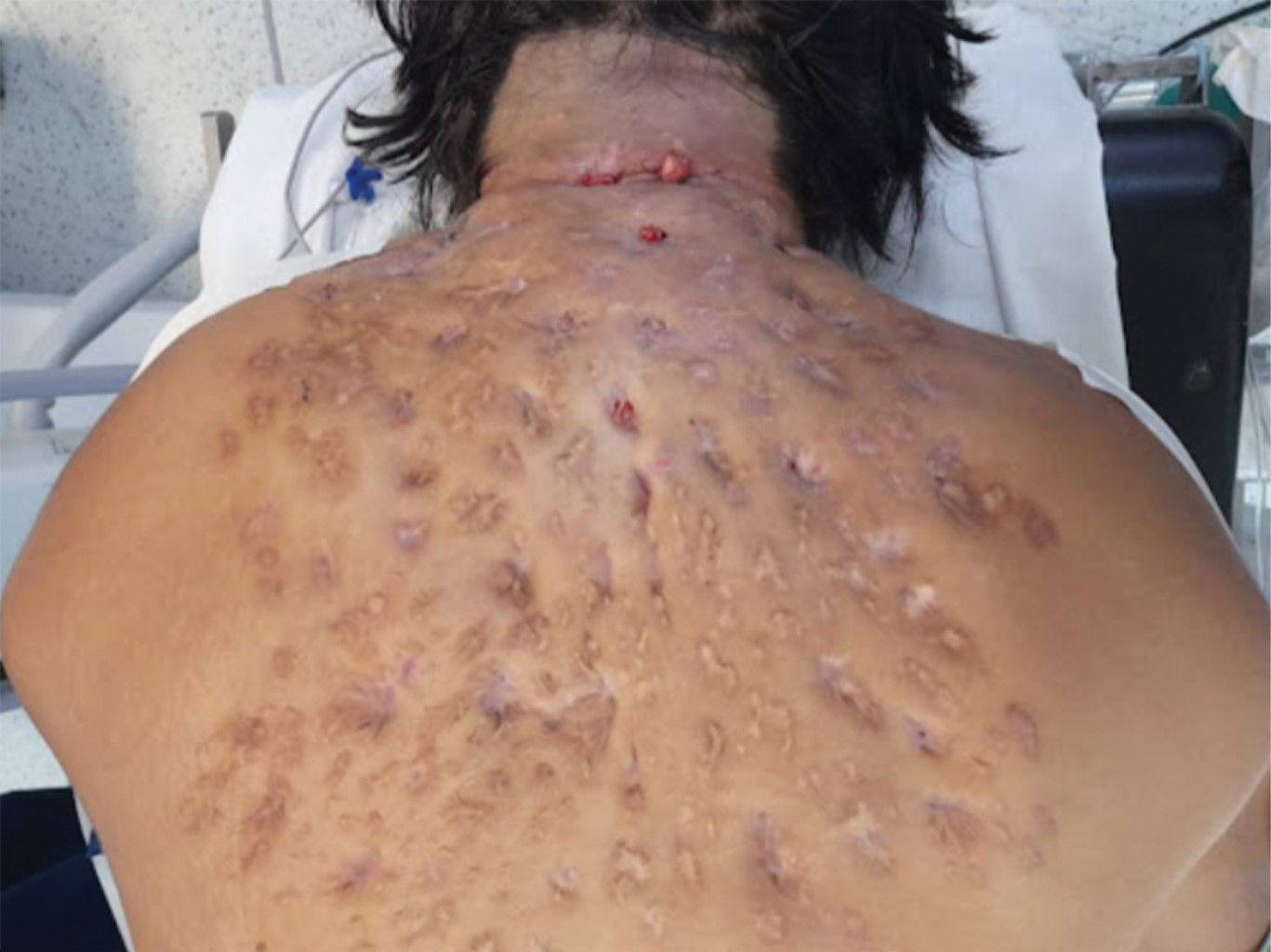 Presenta lesión de 32 × 28 cm región cervicotorácica dorsal con múltiples trayectos fistulosos de 3 × 3 mm de diámetro con salida escasa de material color paja (Figura 1), arcos de movilidad cervical sin compromiso, fuerza bilateral de C5-C6 normal, C7-T1 2/5 y L 2-S1 0/5 bilateral, parestesias de C7 a distal bilateral, tono anal y bulbocavernoso negativo. Se sospecha de mielopatía cervical severa secundario a micetoma infiltrante, se aplicó la escala de Nurick (IN) (Tabla 1)9 y la escala modificada de la Asociación de Ortopedia Japonesa (mJOA) (Tabla 2),10 donde se obtuvo grado 5 de IN y 6 puntos de mJOA.