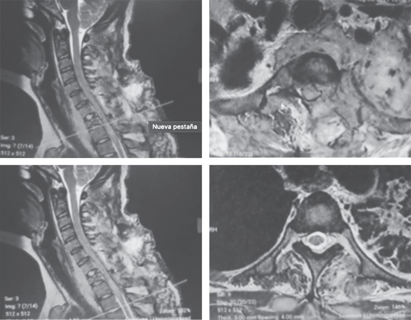 - 3. RMN de columna cervicotorácica: se observa osteólisis del cuerpo de T1, colección peridural de C6-T2, las cuales lateralizan el saco dural y médula hacia la derecha, además de generar compresión radicular bilateral y múltiples colecciones paravertebrales (Figura 2).