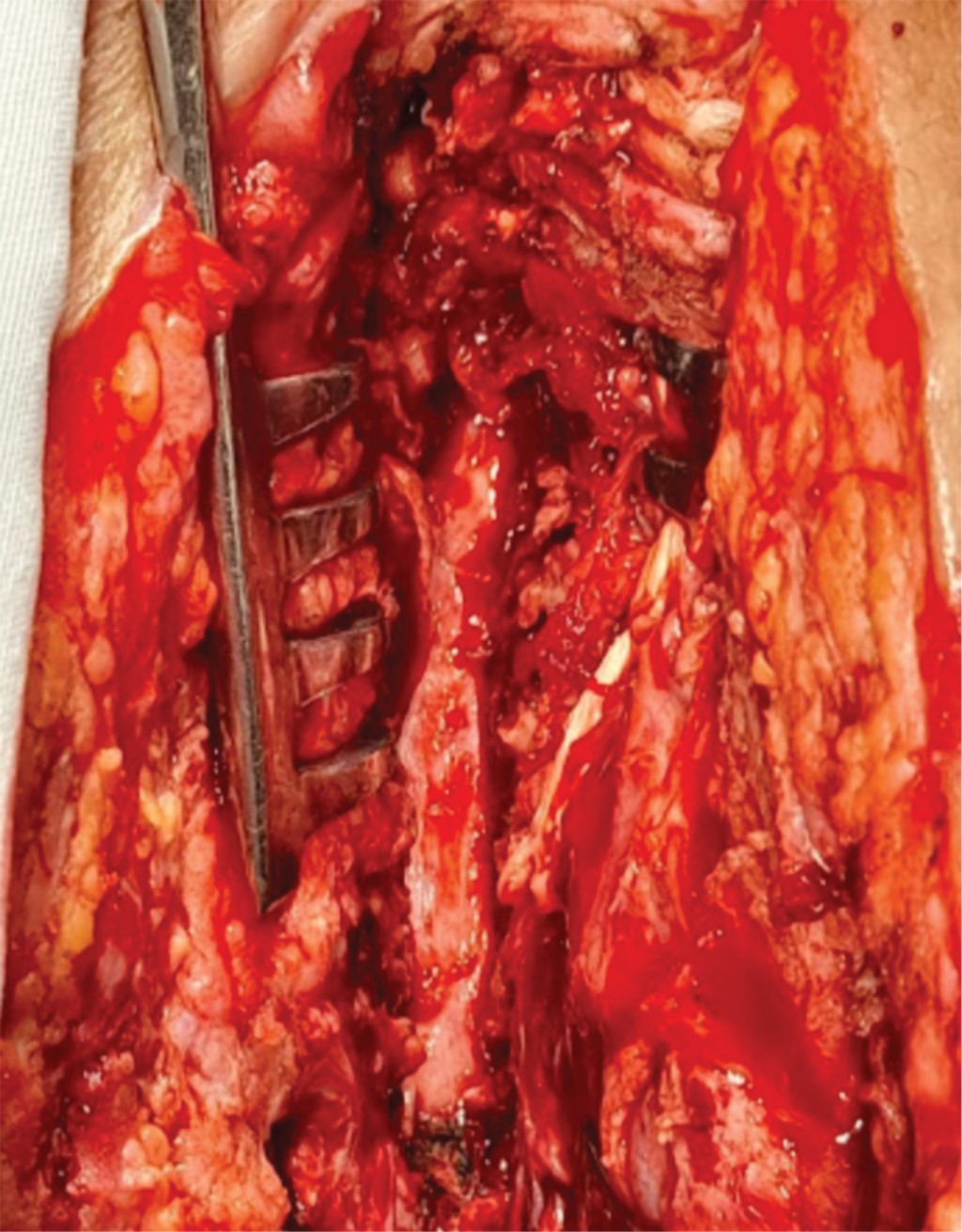 Debido al antecedente de micetoma cutáneo torácico dorsal no infiltrante sin manejo médico y los hallazgos clínicos y radiológicos sospechamos en el síndrome de destrucción vertebral en T1 de origen infeccioso con mielopatía cervical severa, por lo cual se realizó manejo multidisciplinario por dermatología, infectología, medicina interna y ortopedia; por parte de dermatología e infectología se inició dapsona, trimetoprima y sulfametoxazol vía oral, por nuestro servicio se programó para realizarle laminectomías izquierdas de C6-T1, desbridación del espacio epidural y paravertebral, se colocó collarín rígido por tres meses (Figura 3), los reportes de microbiología fueron negativos y los de histopatología concluyeron vasculitis leucocitoclástica e inflamación crónica.