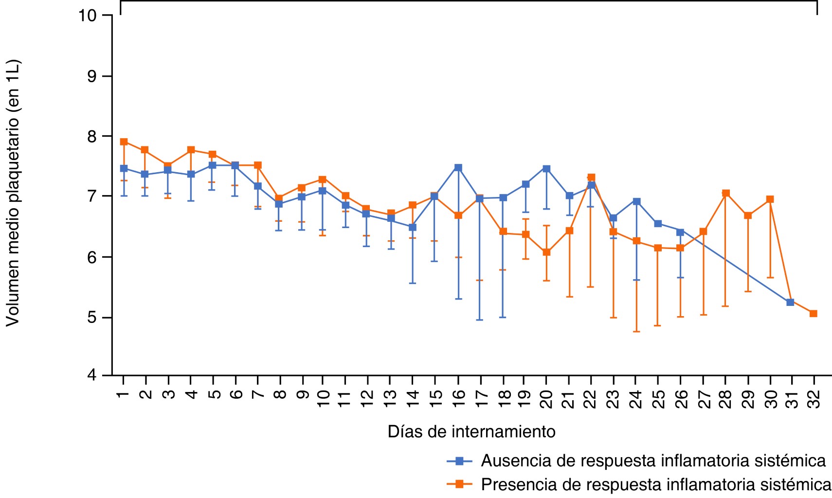 A pesar de lo anterior, en el presente estudio, las medianas de los VMP oscilaron entre 7 y 8 fL, independientemente del día del internamiento o la gravedad clínica de los pacientes establecida como un qSOFA ≥ 2 puntos (Figura 4), similar lo reportado Ozcelik y colaboradores, quienes encontraron que la media del VMP fue baja en un grupo de 43 pacientes adultos hospitalizados en una UCI por COVID-19 y significativamente menor que en el grupo de 54 pacientes ingresados por influenza (p < 0.027).30