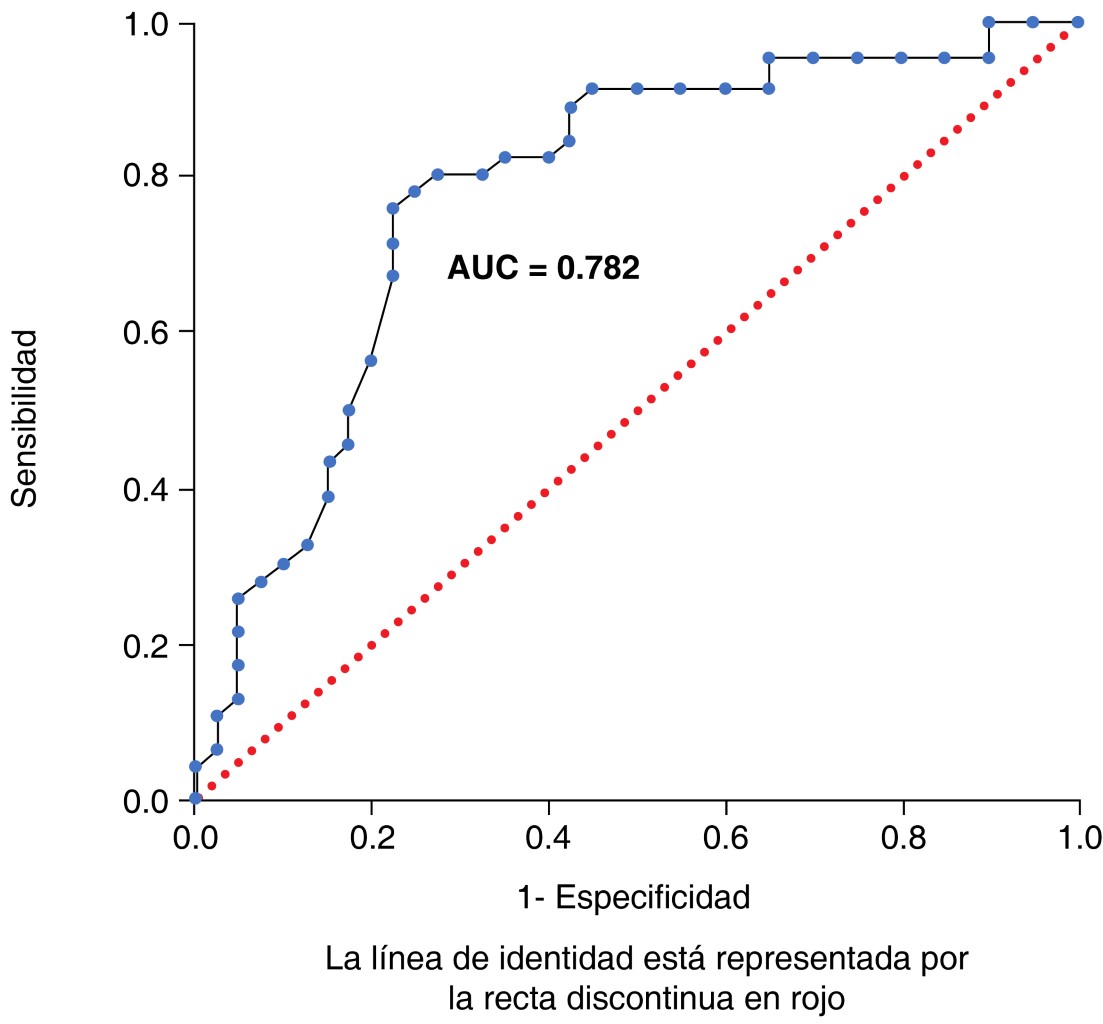 Este valor tuvo una sensibilidad de 62.2% (IC del 95% 46.1-75.9), una especificidad de 69.6% (IC del 95% 55.2-80.9), un valor predictivo positivo (VPP) de 57.5% (IC del 95% 42.2-71.5), un valor predictivo negativo (VPN) de 69.6% (IC del 95% 55.2-80.9) y una razón de verosimilitud positiva (RVP) de 1.79.