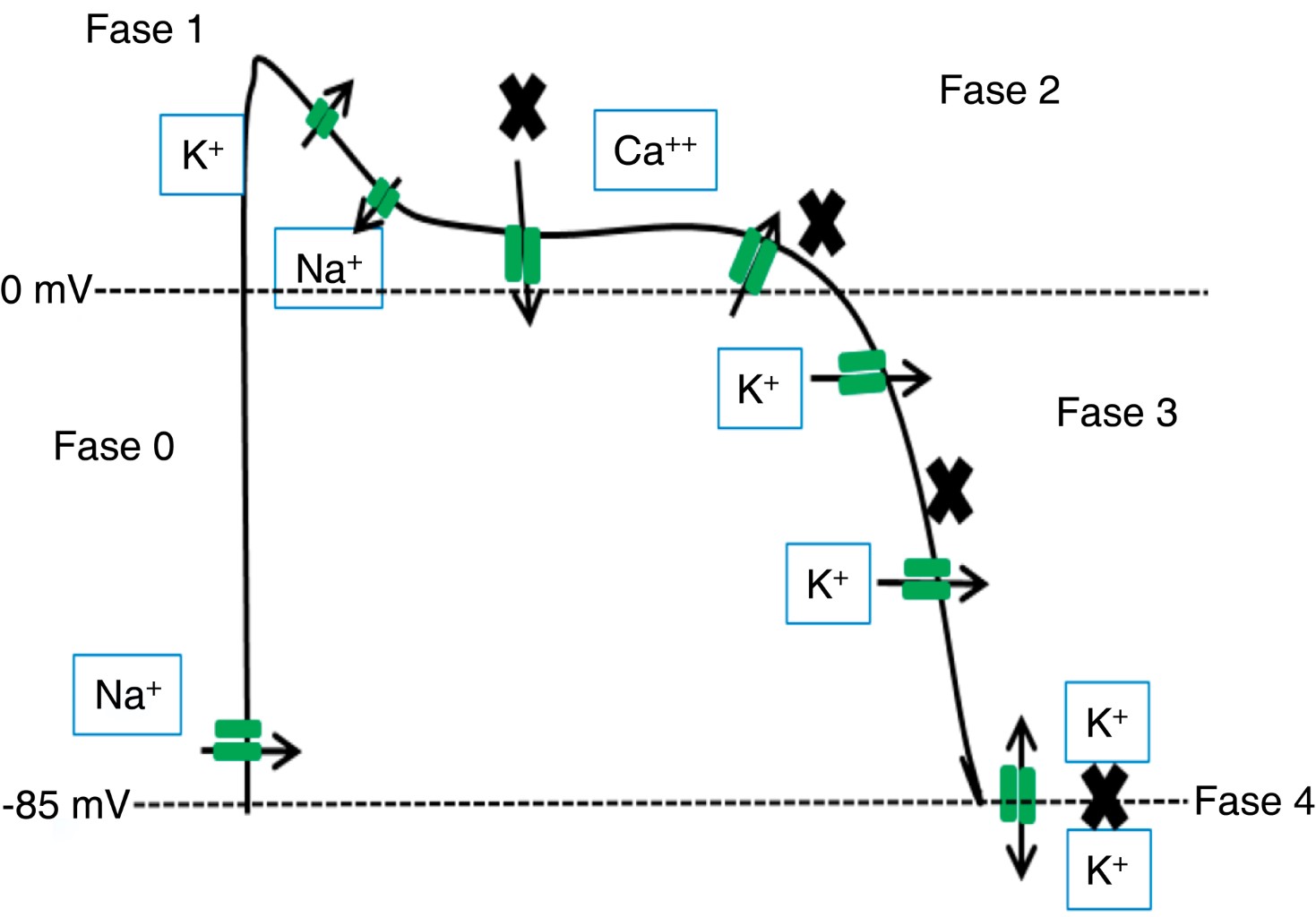 La secuencia normal y la contracción sincrónica de las aurículas y los ventrículos requieren la activación rápida de grupos de células cardiacas que deben permitir cambios rápidos en la frecuencia cardiaca y también responder a los cambios en el tono autónomo. El potencial de acción cardiaco representa los cambios iónicos para que pueda desencadenarse el efecto de contractibilidad y relación del músculo cardiaco, viéndose afectada la fase 2, donde se encuentra el intercambio iónico dependiente de calcio (Figura 4).21
