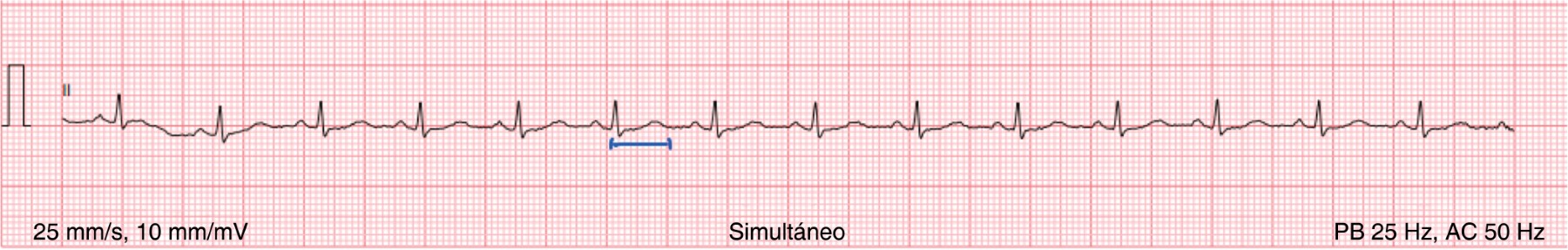La traducción electrocardiográfica más común de hipocalcemia es la prolongación del intervalo QT (Figura 5) como resultado del alargamiento del segmento ST, ocasionalmente, la hipocalcemia puede manifestarse con elevación del segmento ST, simulando un evento isquémico a nivel miocárdico.23