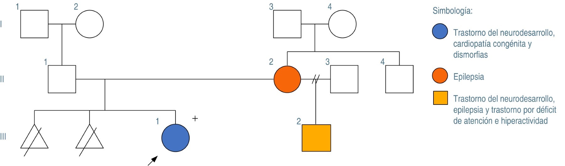 En cuanto a los antecedentes heredofamiliares (Figura 1): madre de 34 años con diagnóstico de epilepsia bajo tratamiento, y con dos abortos previos. Padre de 34 años, aparentemente sano. Medio hermano materno de 12 años con trastorno por déficit de atención e hiperactividad y epilepsia (pero sin valoración por el servicio de genética). Se negó consanguinidad y endogamia. Como antecedentes perinatales, la madre cursó con preeclampsia, se suspendieron antiepilépticos, y se negó exposición a otros teratógenos. Ecografías fetales sin alteraciones. La paciente nació por parto eutócico a las 37 semanas de gestación.