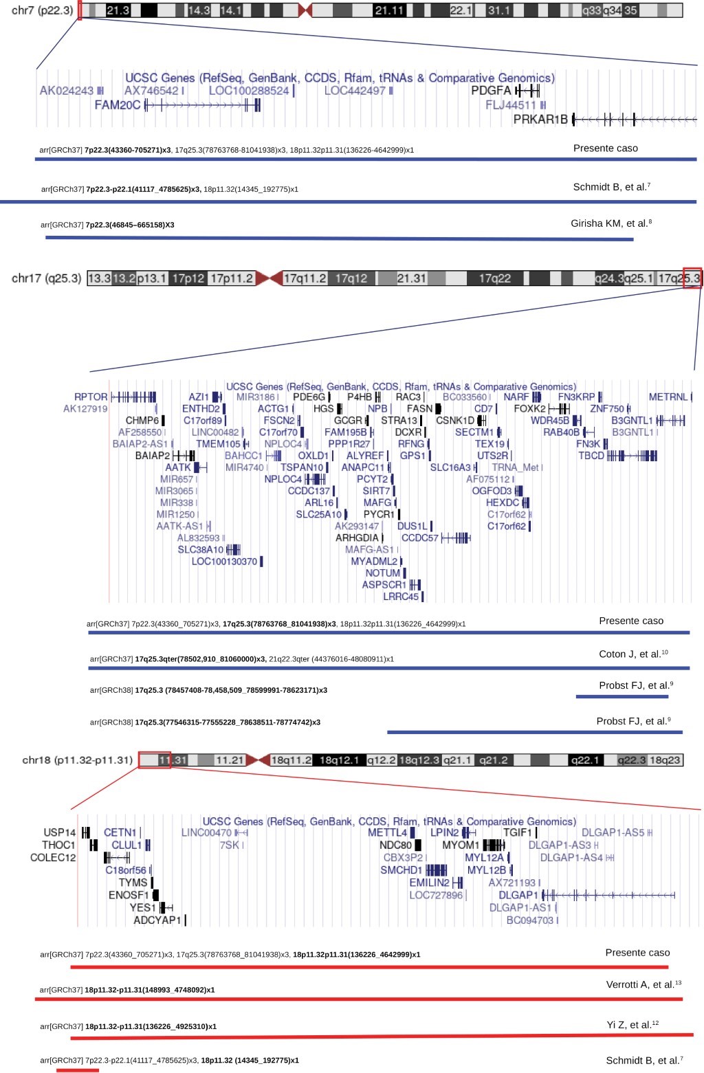 Al revisar el cariotipo tomado a los tres años, junto con los antecedentes familiares y datos clínicos, se solicita microarreglo cromosómico. El estudio se realizó por medio de un microarreglo CytoSCan HD, en el cual se detectaron tres variantes estructurales patogénicas, dos amplificaciones de 662 kilobases (kb) arr[GRCh37] 7p22.3(43360_705271)x3 y 2.2 megabases (Mb) arr[GRCh37] 17q25.3(78763768_81041938)x3 y una deleción de 4.5 Mb arr[GRCh37] 18p11.32p11.31(136226_4642999)x1 (Figura 2). Posterior a la obtención de los resultados se brindó asesoramiento genético a los padres.