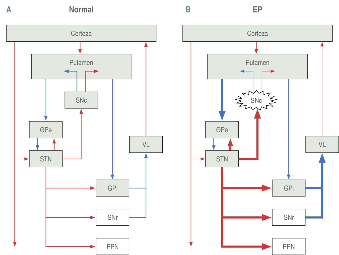 La EP se produce por la degeneración progresiva e irreversible de las neuronas de la substancia nigra pars compacta, lo cual conduce a una depleción en los contenidos de dopamina dentro del circuito de los ganglios basales y otros núcleos cerebrales que reciben proyecciones dopaminérgicas (Figura 1).3 Este déficit de dopamina ocasiona una serie de manifestaciones clínicas motoras y no motoras que deterioran significativamente la calidad de vida de los pacientes.4 En ese sentido, históricamente las complicaciones no motoras han recibido menos atención que las alteraciones del movimiento en los pacientes con EP, particularmente aquellas complicaciones relacionadas con la salud mental.