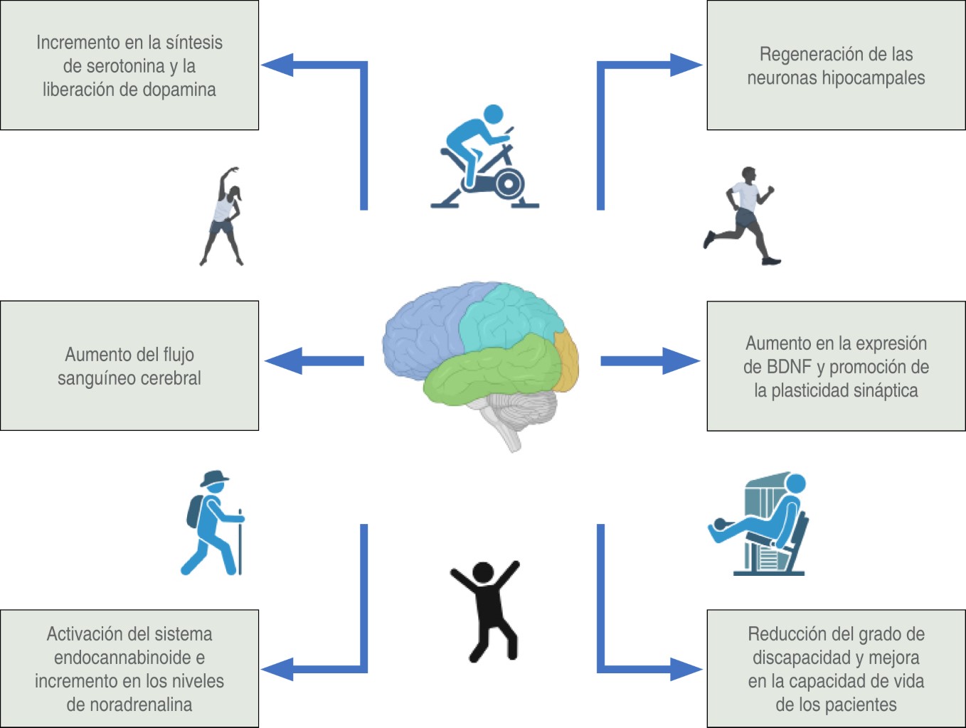 Se ha demostrado que el ejercicio físico puede influir en la degradación de proteínas, reducir la inflamación, optimizar el flujo sanguíneo cerebral e incrementar la producción de factores neurotróficos. Lo cual puede combatir a las alteraciones cerebrales relacionadas con el envejecimiento, los trastornos neurodegenerativos y la depresión.