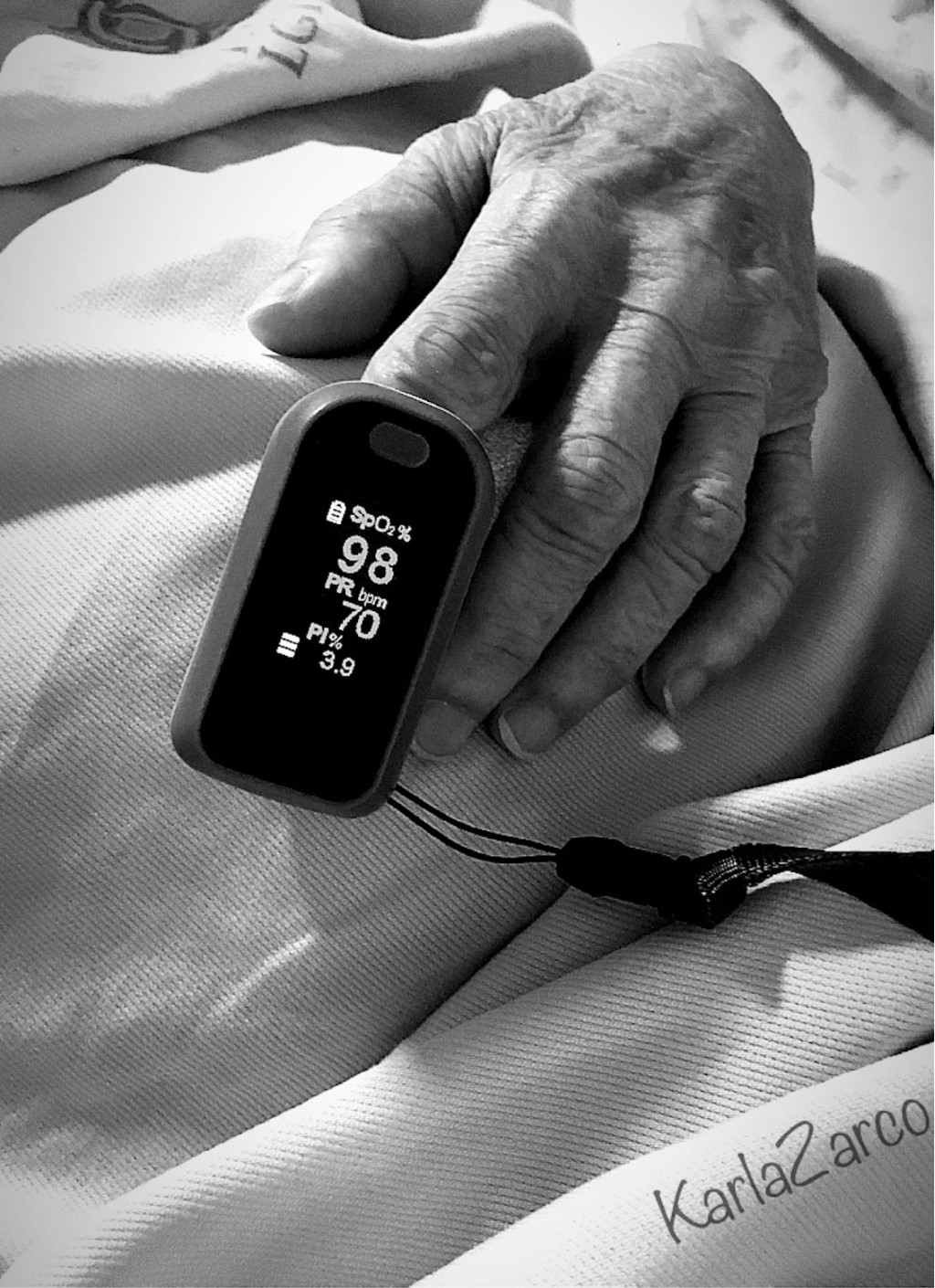 Posterior a cuatro semanas hospitalizado en el área de convalecencia post-COVID de nuestro instituto, este paciente nos dio una dosis de felicidad y satisfacción al tomar su saturación de oxígeno la mañana previa a su egreso a casa. Como personal de salud y como residentes hemos vivido una cara de la pandemia que pocos entenderán… Nadie nunca nos dijo la alegría que nos daría ver una oximetría mayor a 95%. (Figura 1)