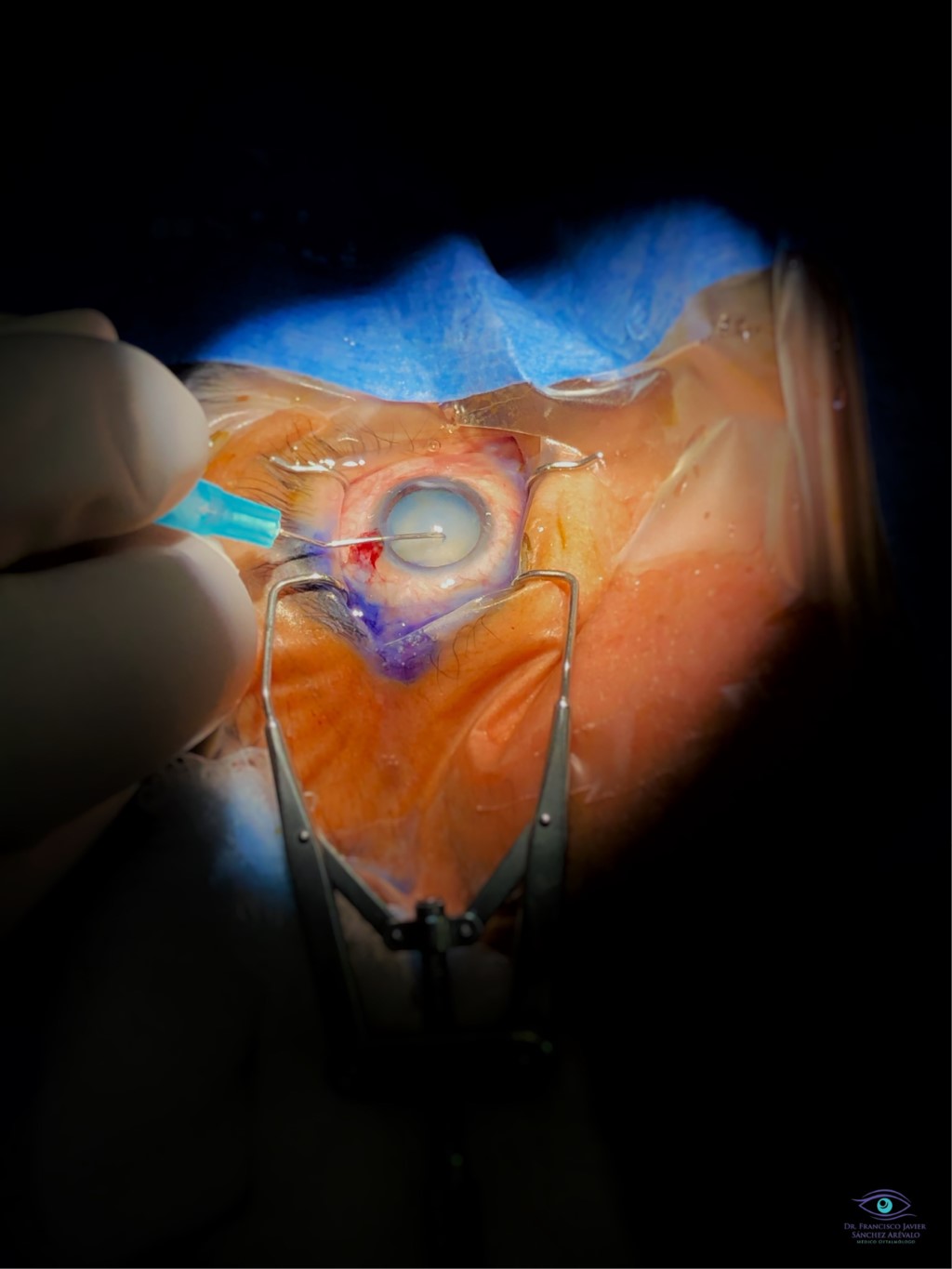 Paciente con catarata blanca, a quien el cirujano le está realizando un desgarro de la cápsula anterior, previa tinción de ésta con azul de tripano, mediante un quistitomo de 25 g para poder realizar posteriormente una capsulorrexis circular continua. La capsulorrexis es el procedimiento por el cual se extrae la cápsula anterior para poder realizar emulsificación y aspiración del cristalino. (Figura 2)