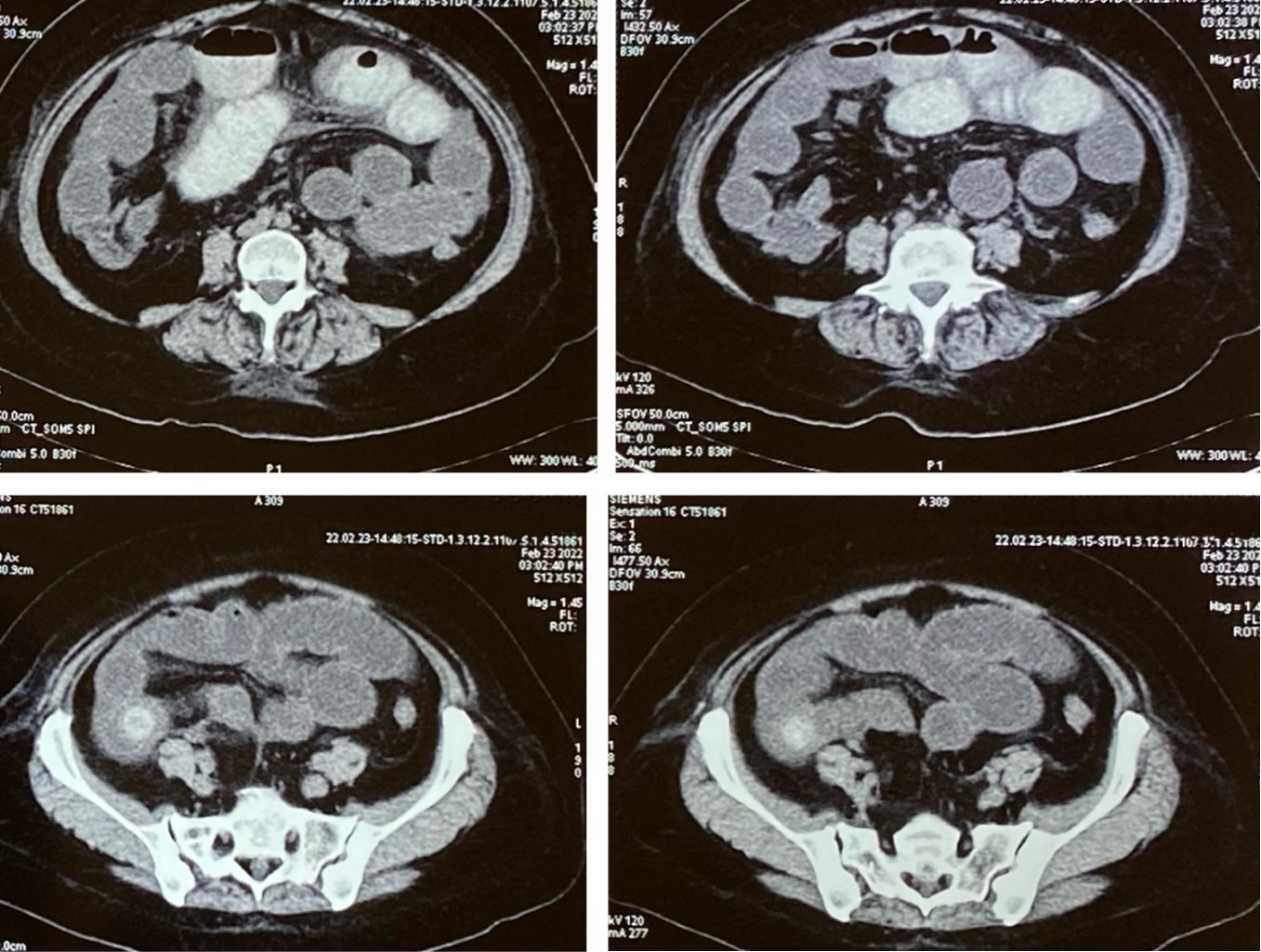 Paciente femenino de 58 que acude al servicio de urgencias por presentar cuadro clínico de ocho días de evolución caracterizado por dolor en epigastrio 9/10 puntos en la escala visual análoga, tipo punzante acompañado de náuseas que progresaron a vómitos de contenido gastrobiliar, evacuaciones y canalización de gases presentes. Se inició manejo con antiácidos por médico particular previo al ingreso a urgencias sin mostrar mejoría de sintomatología. A la exploración física muestra como hallazgos de relevancia distensión abdominal con dolor a la palpación superficial y profunda localizado en epigastrio y mesogastrio; timpanismo generalizado a la auscultación y peristalsis disminuida. No se encuentra resistencia muscular ni datos de irritación peritoneal al momento de su ingreso. Como antecedentes de importancia refirió alérgica a dextrometorfano y penicilina. Negó antecedentes de cuadros dolorosos abdominales sugestivos de colecistitis. También se negaron enfermedades crónico degenerativas y cirugías. En sus paraclínicos presenta leucocitos 18.13 × 103/mL, con neutrófilos 15.56 × 103/mL, linfocitos 1.44 × 103/mL, hemoglobina 11.60 g/dL, hematocrito 34.60%, plaquetas 359 × 103/mL, creatinina 0.60 mg/dL, nitrógeno ureico 8.6 mg/dL, urea 18.5 mg/dL, sodio 138 mEq/L, potasio 3.3 mEq/L y cloro 104 mEq/L. Se realizó tomografía abdominal con contraste vía oral con reporte de vesícula biliar con material de contraste proveniente del duodeno, que mostró comunicación anómala entre ambas estructuras en relación con el trayecto fistuloso a nivel de la segunda porción del duodeno, asas de intestino secundario a múltiples niveles hidroaéreos secundario a lito de 24 mm en íleon distal a 40 cm de la válvula ileocecal (Figura 1) con distensión de asas intestinales proximales a ese sitio. Se colocó sonda nasogástrica en su primer día de ingreso hospitalario con un gasto de 1,400 cm3 en las primeras 24 horas. En su segundo y tercer día de estancia intrahospitalaria la paciente no tuvo evacuaciones, ni canalización de gases; presencia de significativa distensión abdominal y timpanismo generalizado, aun sin datos de irritación peritoneal. Durante el cuarto día de estancia intrahospitalaria previo a su intervención quirúrgica se reportó evacuación con expulsión de heces y el cálculo biliar.