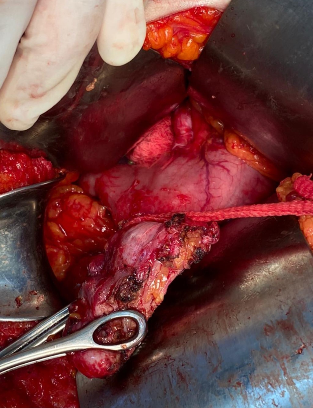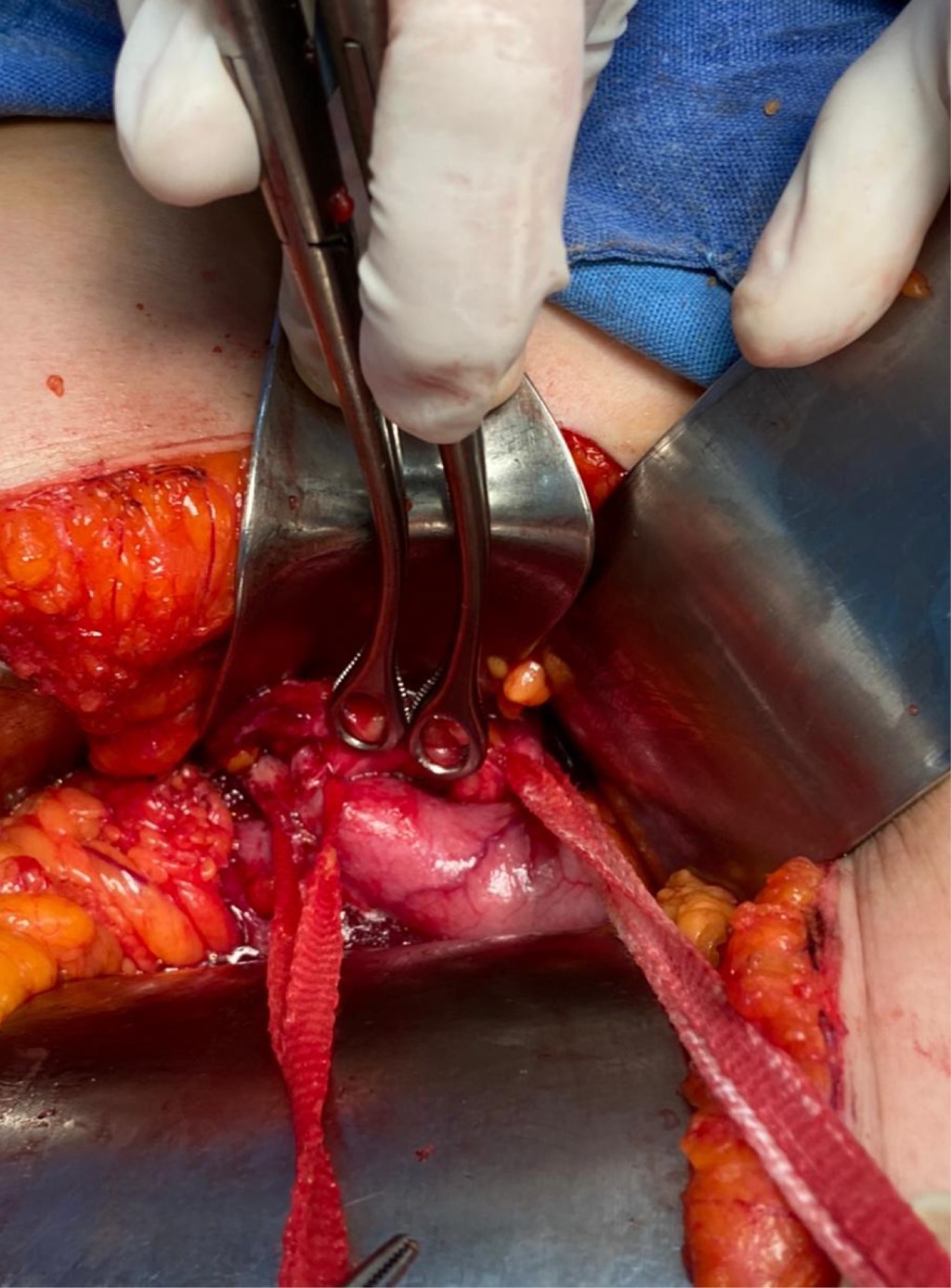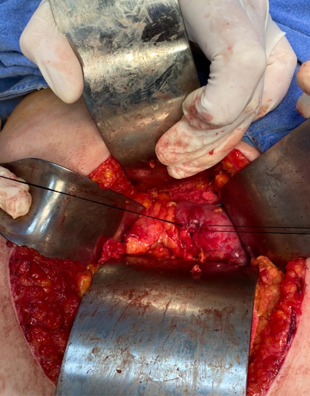 Posteriormente fue sometida a laparotomía exploradora, en la cual se observó vesícula biliar esclerotrófica (Figura 2) con múltiples adherencias de epiplón y fístula de 5 mm que conectaba la vesícula biliar con la segunda porción del duodeno (Figura 3), se hizo revisión sistemática de todo el intestino en búsqueda de litos residuales sin encontrar presencia de los mismos. Por lo cual no se realizó enterolitotomía longitudinal. Se procedió a efectuar cierre primario de fístula (Figura 4) y colecistectomía.