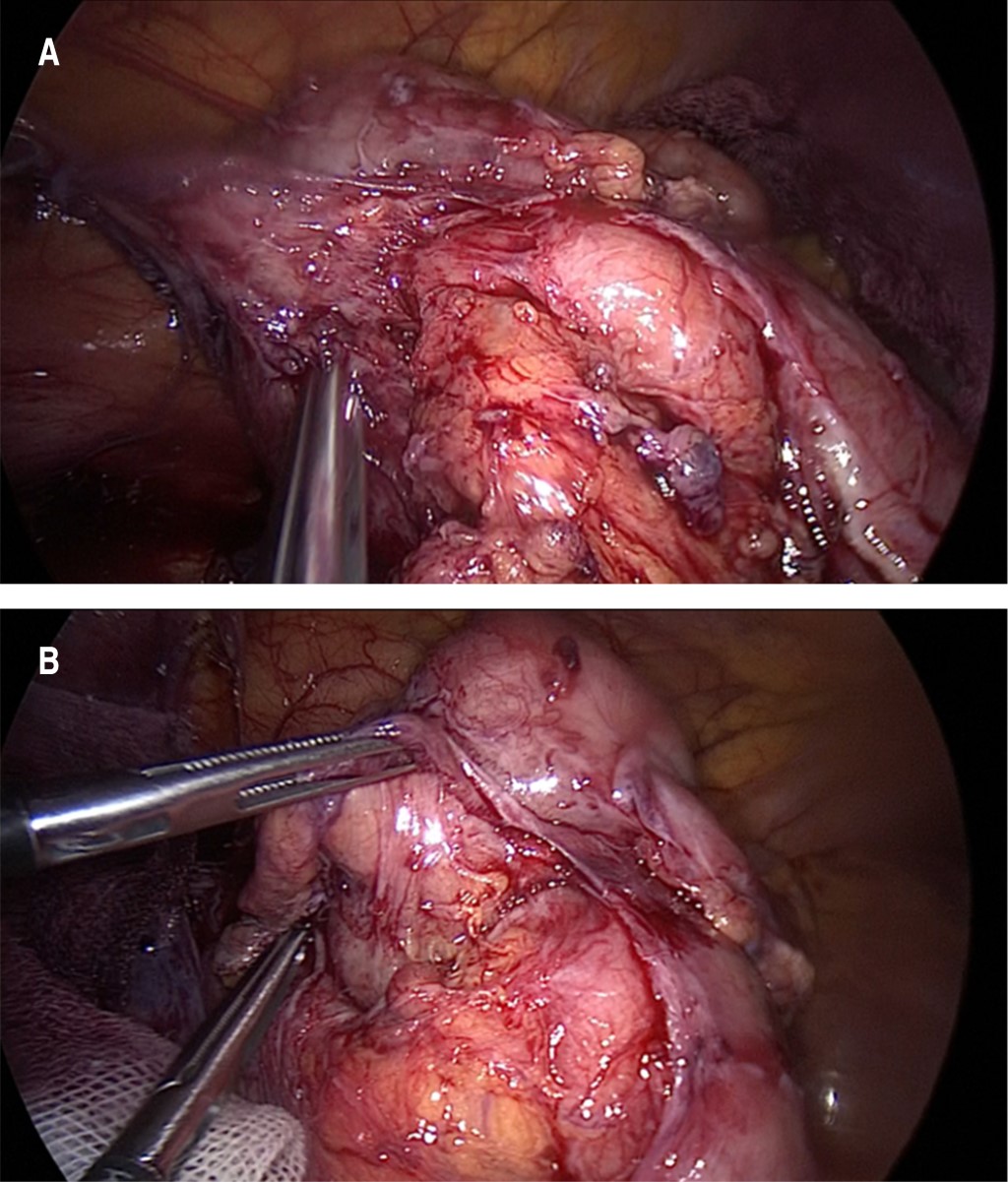 Paciente femenino de 36 años, con antecedentes familiares de diabetes mellitus por parte de su abuela materna. Niega tabaquismo, etilismo u otras toxicomanías. Antecedentes personales de enfermedad celíaca de reciente diagnóstico y apendicectomía 20 años antes. Presenta dolor abdominal difuso que se localiza en hipocondrio derecho con irradiación a región dorsal derecha acompañado de fiebre y evacuaciones disminuidas en consistencia, inicialmente tratada con paracetamol y antibióticos de amplio espectro, sin presentar mejoría, por lo que es revalorada. A la exploración física se observa paciente con taquicardia, febril, ligeramente deshidratada, con datos de irritación peritoneal (rebote en cuadrante inferior derecho del abdomen). En la tomografía de abdomen se observa una imagen compatible con apendicitis de muñón, con fecalito hacia la punta (Figura 1). Se reporta por imagenología: "Proceso inflamatorio a nivel de la fosa iliaca derecha sugiere como primera posibilidad diagnóstica apendicitis de muñón con presencia de plastrón. Imagen que sugiere apendicolito. Adenopatías pericecales y perineales de apariencia inflamatoria". La paciente pasa a laparoscopia diagnóstica donde se encuentra plastrón inflamatorio en región de ciego que no se puede disecar de manera adecuada (Figura 2A y B ). Se realiza conversión a laparotomía, encontrando muñón apendicular largo, abscedado y con afectación de válvula ileocecal, por lo que se realiza ileocequectomía y anastomosis latero lateral mecánica con engrapadora lineal cortante. El reporte de patología indica "hallazgos compatibles con apendicitis aguda". La paciente evoluciona adecuadamente en el postoperatorio.