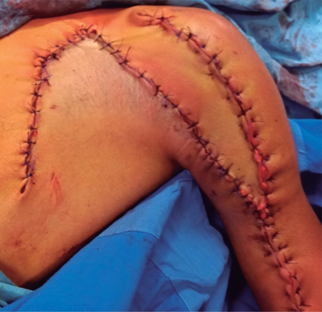 Realizamos un colgajo local de patrón aleatorio basado en perforantes de las arterias toracodorsal y toracolateral adyacente al defecto de tejidos blandos. La selección del colgajo se basó de forma sólida en la detección de una señal Doppler audible. El movimiento del colgajo fue llevado a cabo con una maniobra de rotación. Yildirim y colaboradores presentaron un trabajo de colgajos locales de patrón aleatorio basados en perforantes en varias regiones anatómicas, llegando a la conclusión de que este concepto es una técnica segura, confiable y versátil, con resultados estéticos y funcionales buenos.23 En la cirugía de colgajo local de patrón aleatorio basado en perforantes es obligatorio realizar de forma preoperatoria el ultrasonido Doppler, ya que provee información útil acerca de la topografía y calidad de los vasos perforantes.24,25