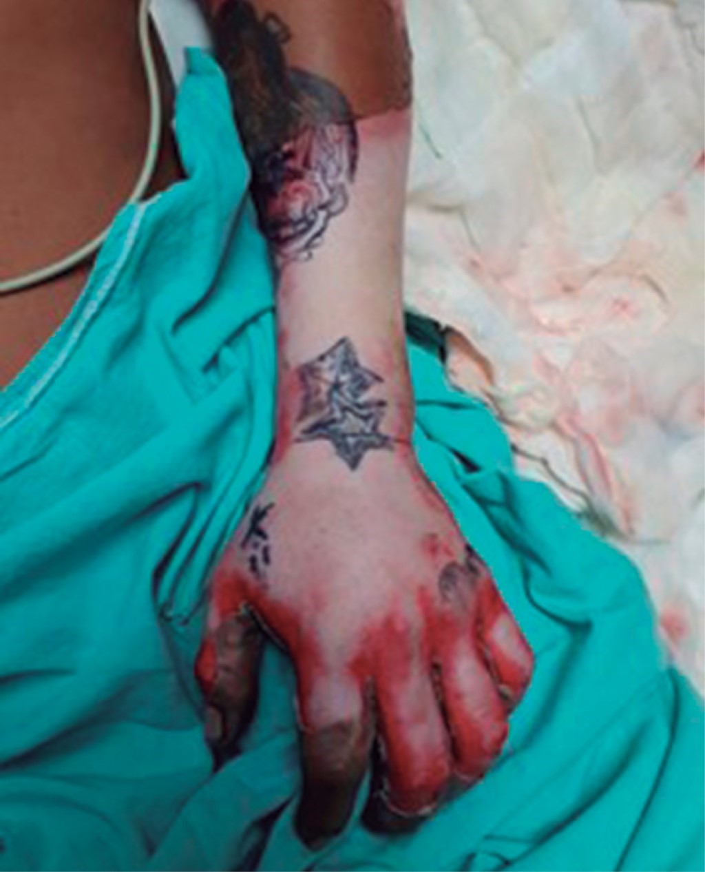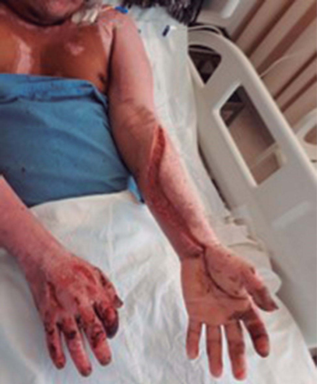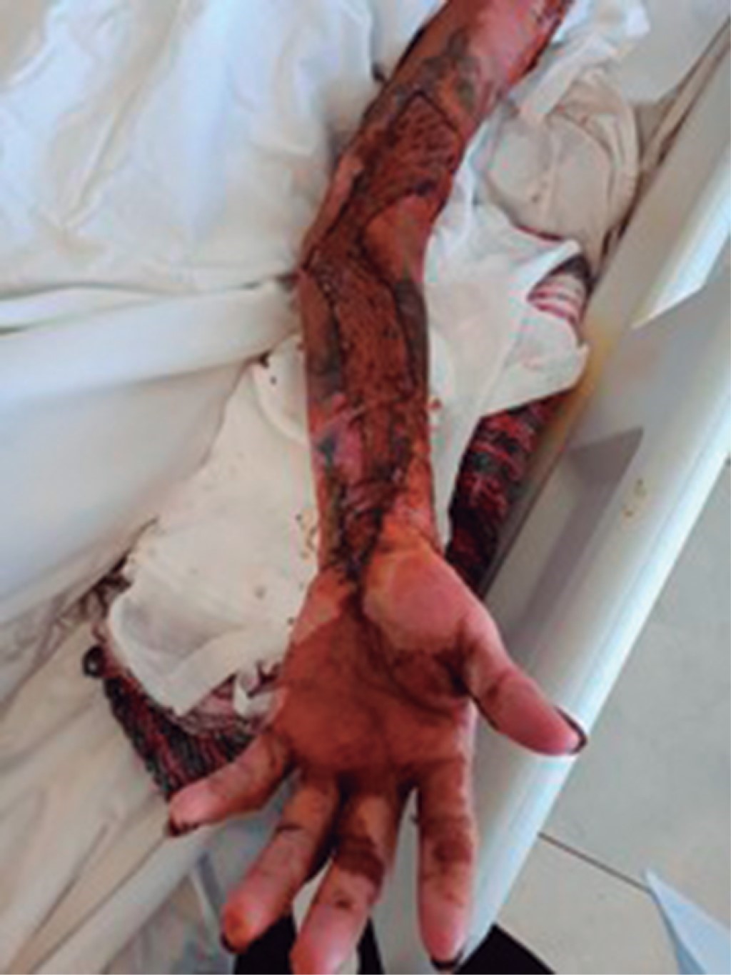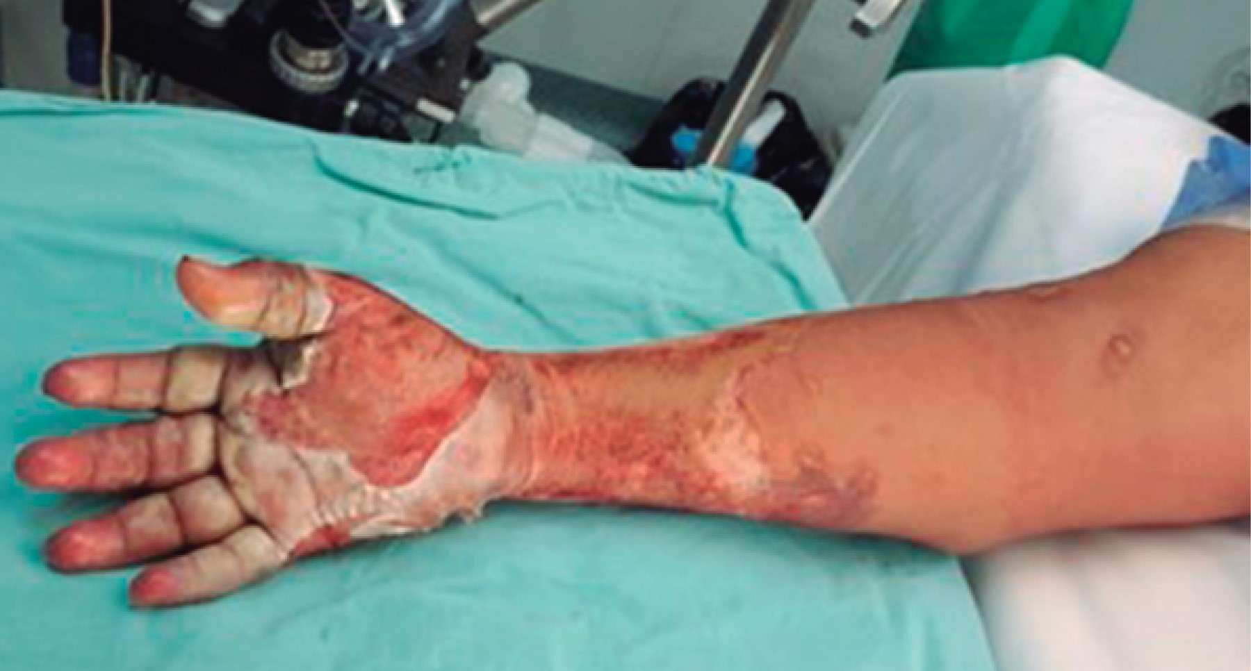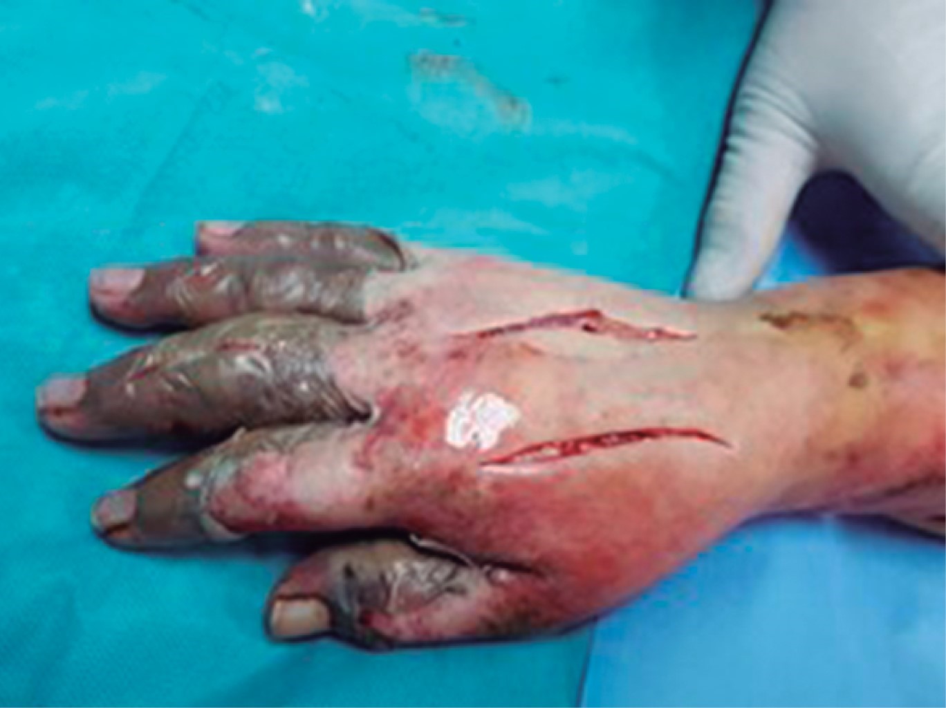 Hombre de 29 años que sufrió quemadura de segundo grado por fuego, producto de la combustión de diesel de seis horas de evolución. A su ingreso se observó quemaduras en la totalidad del miembro superior izquierdo, con ausencia de pulsos, extremidad fría, inmovilidad, anestesia total del mismo y contractura en flexión de la mano izquierda (Figura 4). Se realizó de urgencia fasciotomía de mano, antebrazo y brazo izquierdo con liberación del túnel del carpo izquierdo (Figura 5). El paciente presentó una adecuada evolución y respuesta al tratamiento quirúrgico, conservando funcionalidad de la extremidad.
