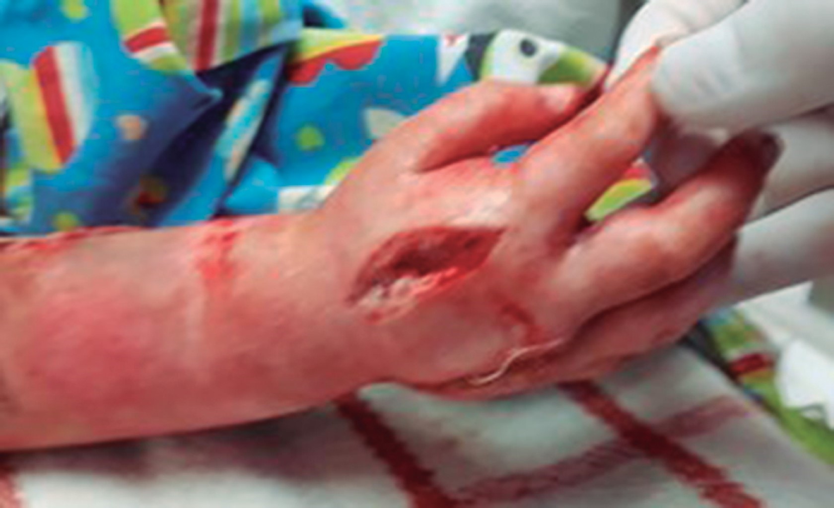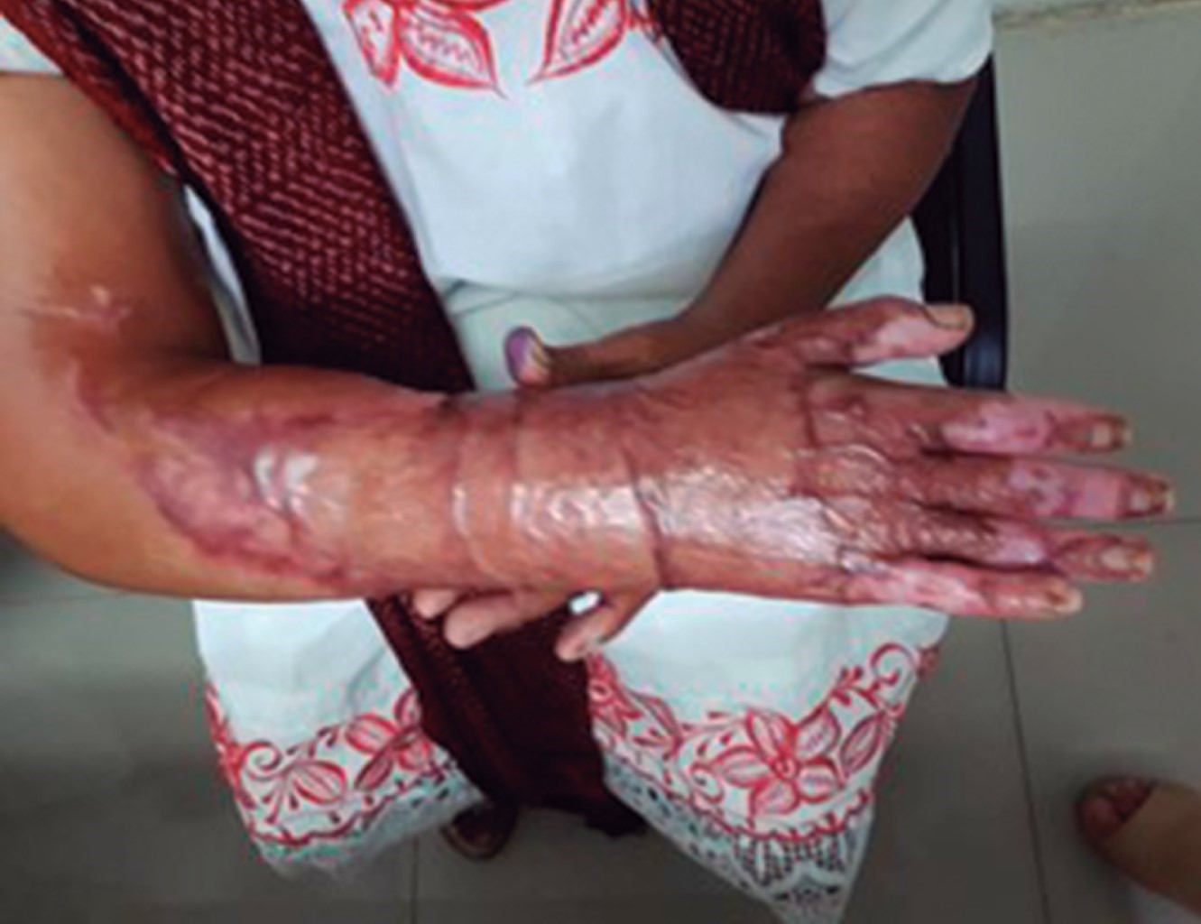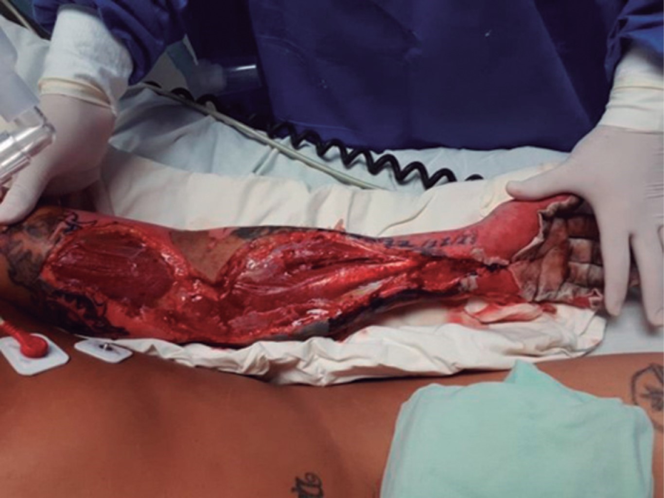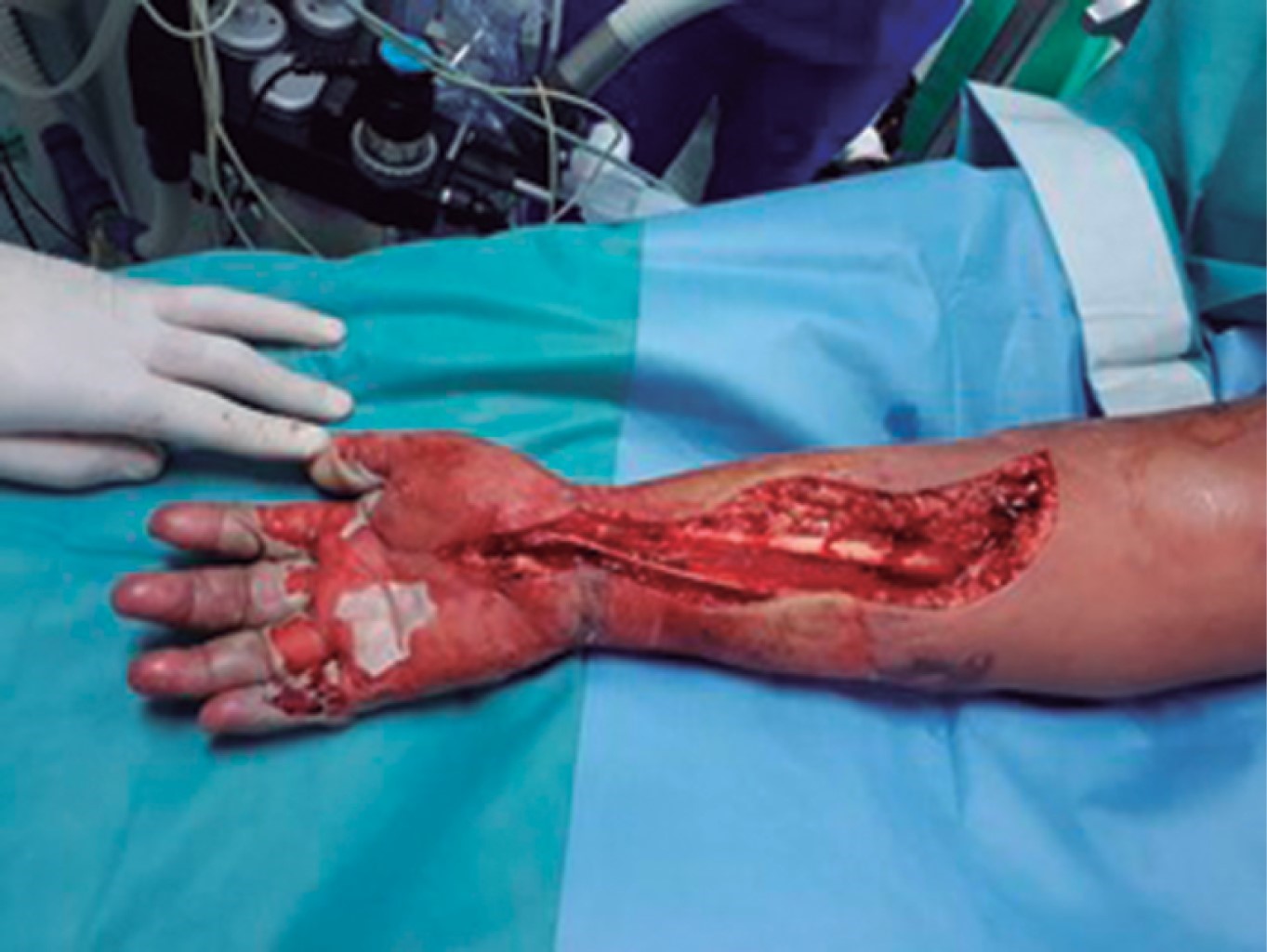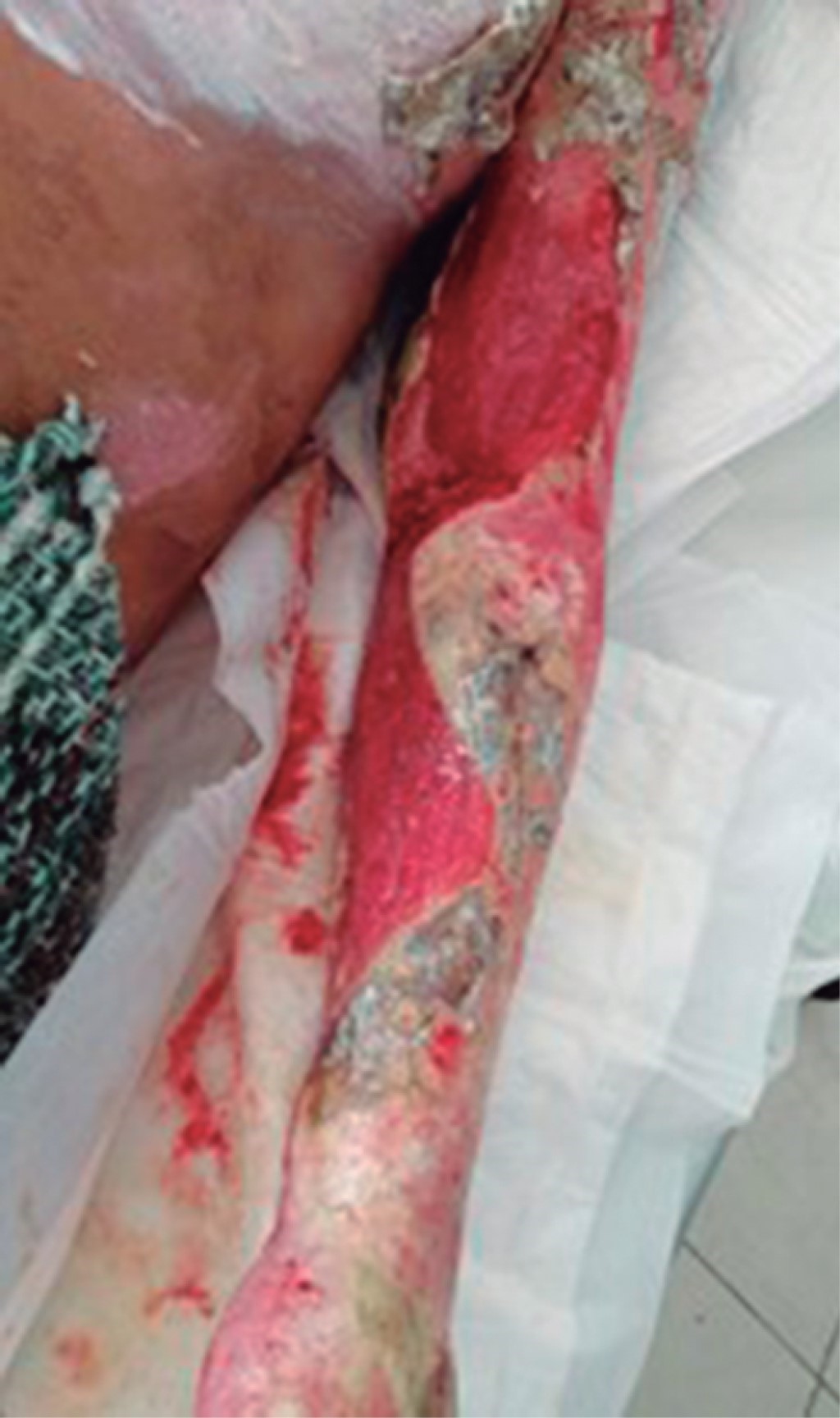 Hombre de 29 años que sufrió quemadura de segundo grado por fuego, producto de la combustión de diesel de seis horas de evolución. A su ingreso se observó quemaduras en la totalidad del miembro superior izquierdo, con ausencia de pulsos, extremidad fría, inmovilidad, anestesia total del mismo y contractura en flexión de la mano izquierda (Figura 4). Se realizó de urgencia fasciotomía de mano, antebrazo y brazo izquierdo con liberación del túnel del carpo izquierdo (Figura 5). El paciente presentó una adecuada evolución y respuesta al tratamiento quirúrgico, conservando funcionalidad de la extremidad.