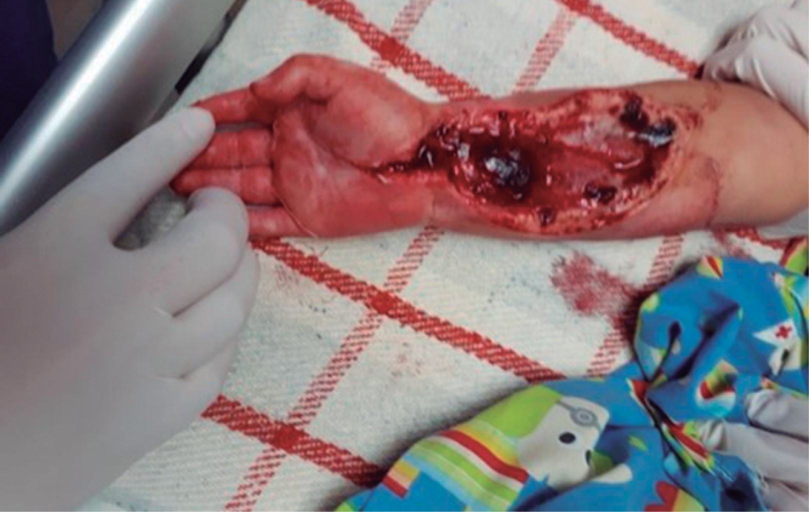 Niño de un año, sin antecedentes de relevancia, que sufrió quemadura eléctrica de 12 horas de evolución al tocar resistencia para calentar agua, desarrollando quemadura circular en miembro superior derecho. A la exploración inicial se encontraba normotenso, taquicárdico, taquipneico, saturando a 98%, con una fracción inspirada de oxígeno (FiO2) de 0.21, temperatura de 36 oC, sin alteraciones en el electrocardiograma. Se evidenciaron quemaduras con compromiso de 20% de la superficie corporal total, clasificadas como de segundo y tercer grado, de predominio en tórax y miembro superior izquierdo, presentó ausencia de pulsos, mano contracturada, ausencia de sensibilidad y tensión de compartimentos de la mano derecha (Figuras 1 y 2). Se inició tratamiento con hidratación intravenosa así como manejo quirúrgico con fasciotomía de antebrazo y mano de urgencia (Figura 3). El paciente presentó una adecuada evolución sin necesidad de reintervención, con funcionalidad conservada de la extremidad.