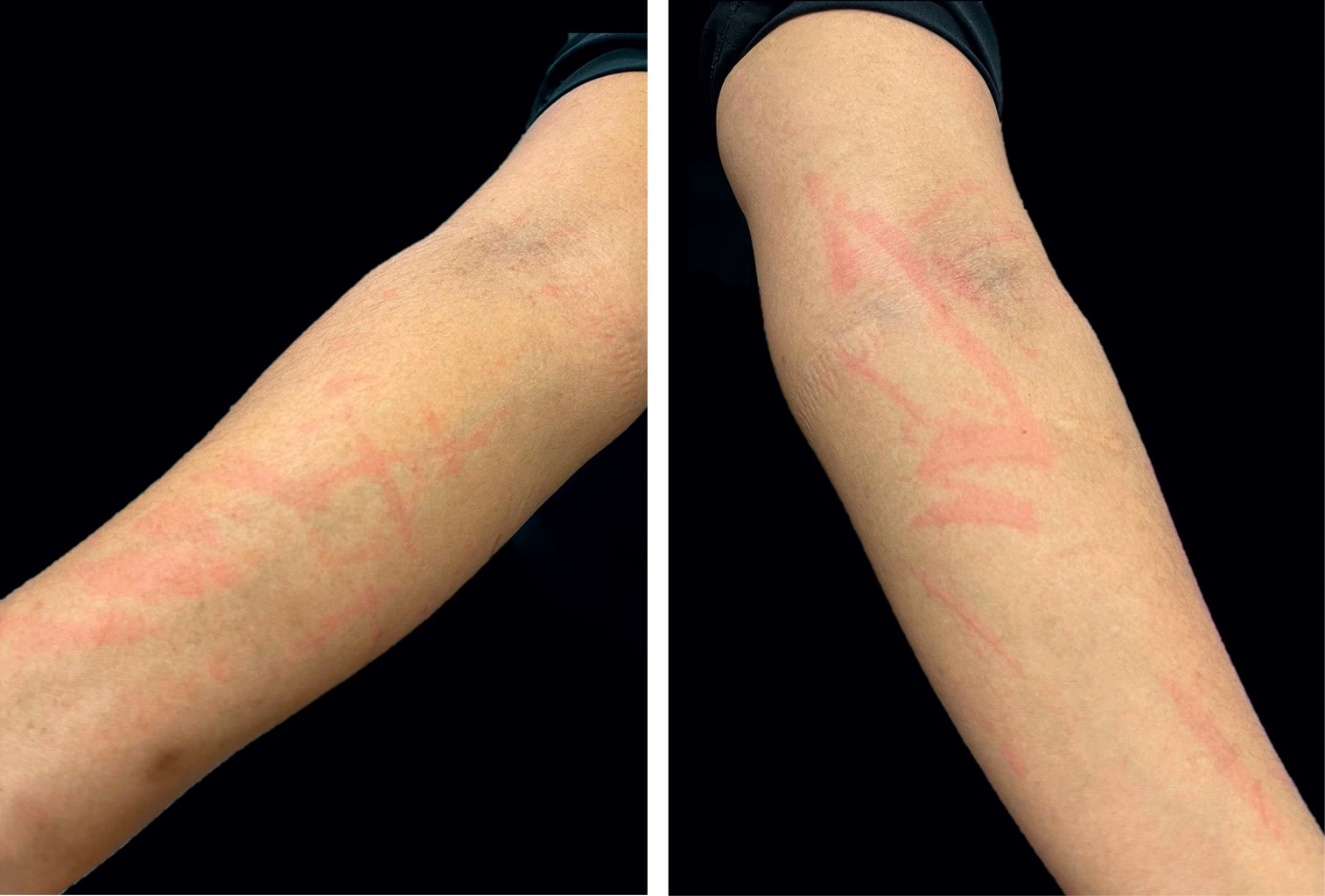 Dermografismo. El dermografismo (urticaria dermográfica o urticaria facticia) es la forma más frecuente de urticaria física. Se manifiesta por ronchas eritematosas lineales en la dermis, secundarias a la aplicación de un estímulo externo fuerte, por lo que se le asignó dicho nombre, que literalmente significa "escritura en la piel" (Figura 1). Es una respuesta exagerada a una presión, frotamiento o rascado relativamente menor, por ejemplo, inducida por cuellos, puños o cinturones de los pantalones, que por lo general desaparece minutos después del cese del estímulo causal. Se ha observado dermografismo en personas con dermatitis atópica, diabetes, hipertiroidismo o hipotiroidismo, menopausia, embarazo o relacionado con medicamentos.20,21