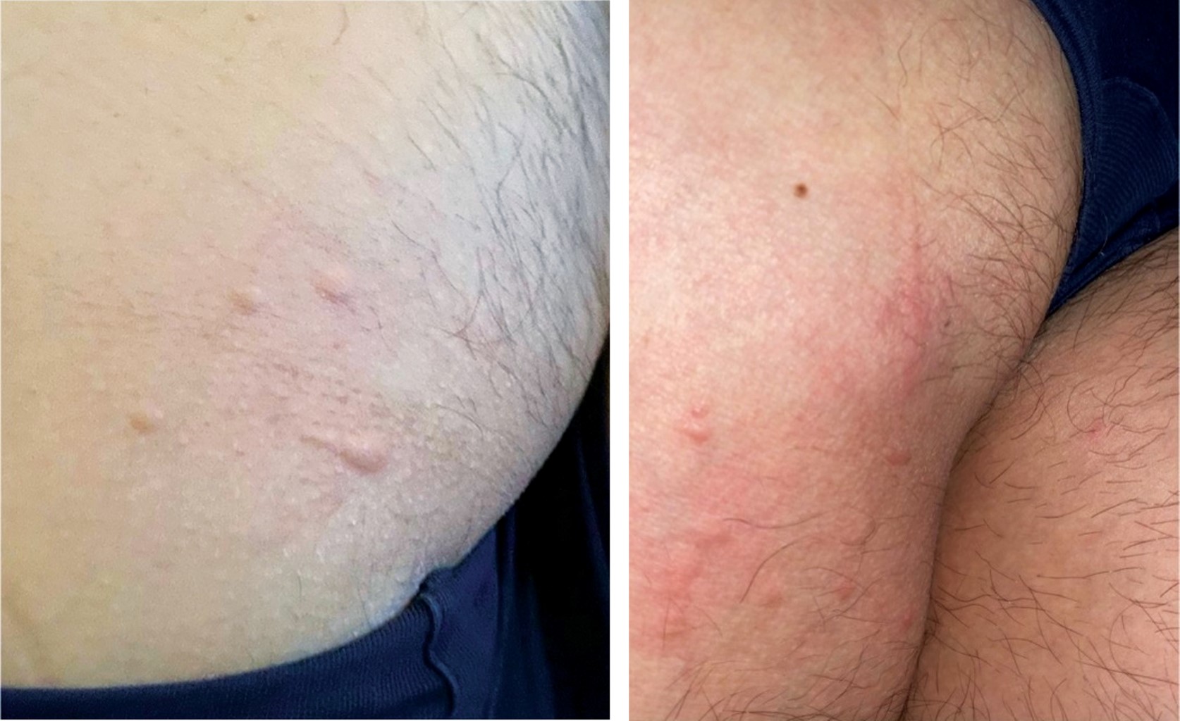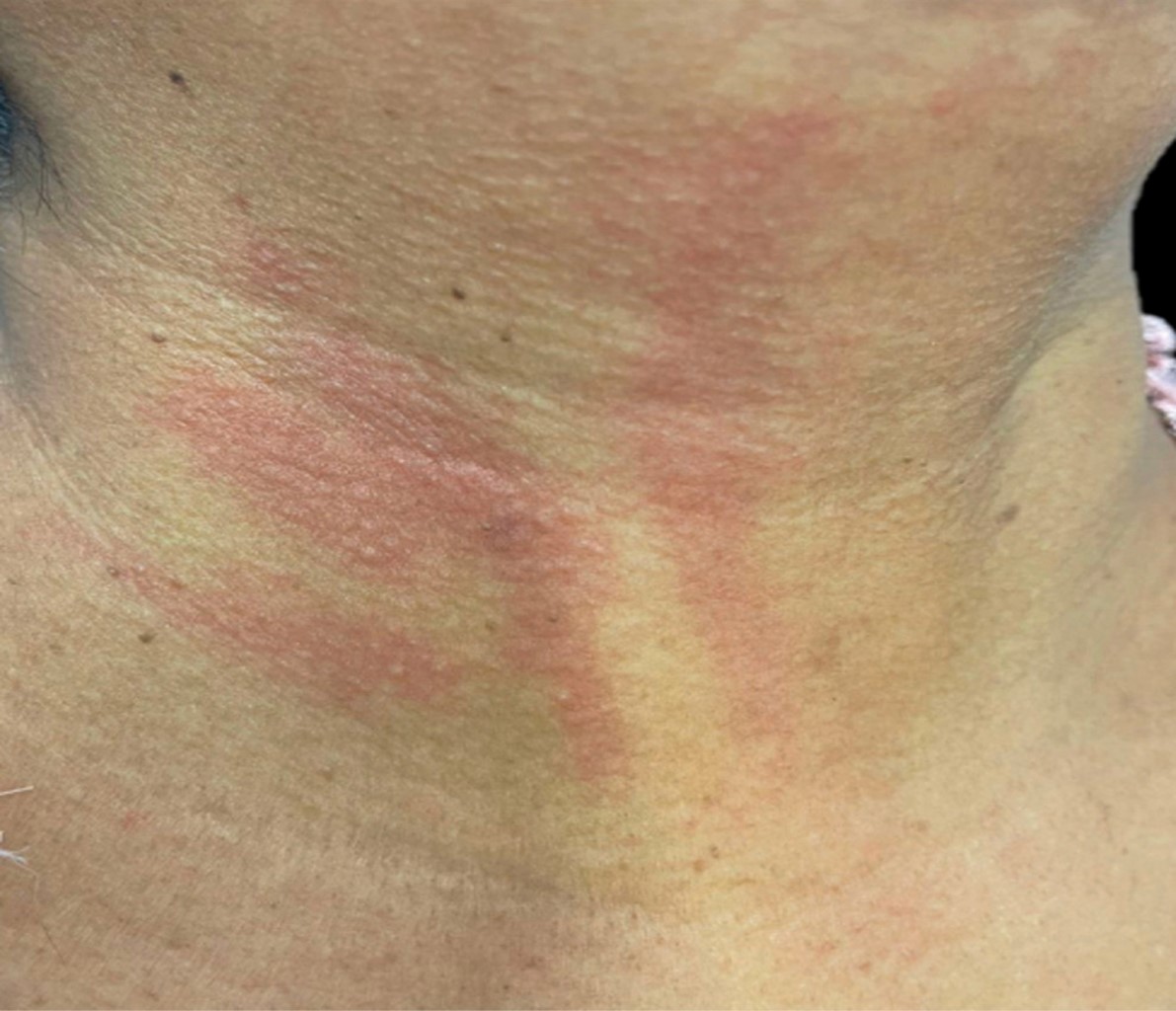 Urticaria colinérgica. La urticaria colinérgica se manifiesta con prurito, eritema y ronchas de aspecto papular inducidas por el ejercicio, el calentamiento activo o pasivo (por ejemplo, baño con agua caliente) (Figura 3). En algunos pacientes, el estrés emocional y los alimentos o bebidas calientes y picantes también pueden desencadenar síntomas.44 Representa alrededor de 30% de todos los casos de urticaria inducida, y 5% de todas las urticarias crónicas espontáneas. La edad de inicio del padecimiento es entre 20 y 30 años, predominando en mujeres. Por lo general, las lesiones cutáneas duran de 15 a 60 minutos y se localizan con frecuencia en el tronco y las extremidades. Pueden coexistir varios patrones morfológicos dermatológicos, incluido el angioedema.45