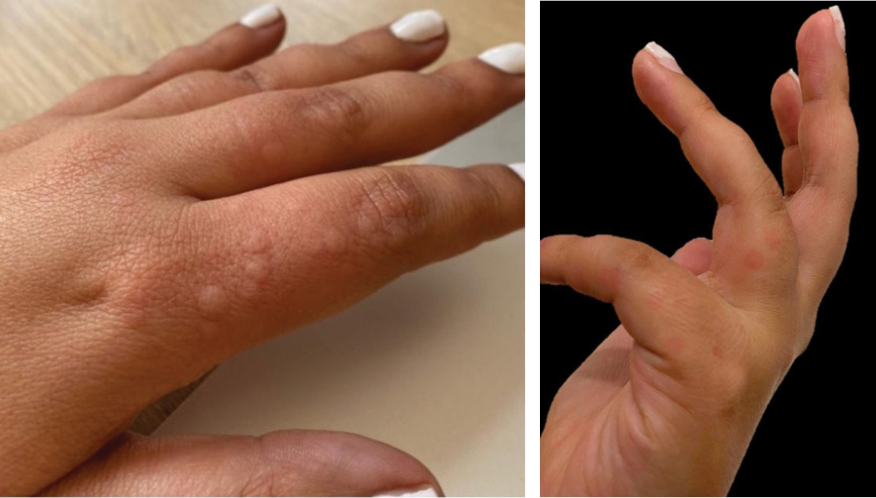 Urticaria por presión retardada. La urticaria por presión retardada o angioedema por presión retardada se manifiesta con edema eritematoso similar al angioedema en áreas de la piel y mucosas expuestas a la presión (Figura 2). Se desarrolla con frecuencia en la cara, manos, tronco, glúteos, piernas y pies. Es poco común, aunque ocupa el tercer lugar entre todas las urticarias inducidas. Las ronchas clásicas no se desarrollan en este tipo de urticaria.2 Se pueden acompañar de prurito o ardor y se desarrollan después de cuatro a seis horas, con rango de 0.5 a 12 o, a veces, inmediatamente después de estar en contacto con el estímulo, y pueden persistir durante horas, en ocasiones hasta más de 24. La edad promedio de aparición de la enfermedad es entre 20 y 30 años.20