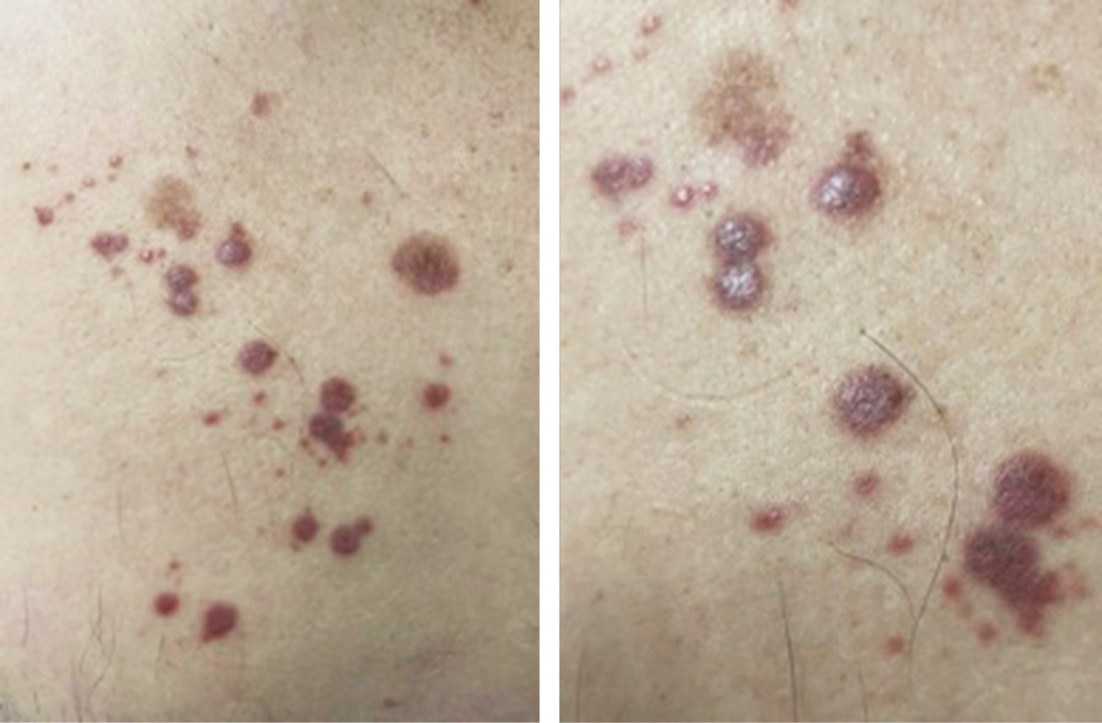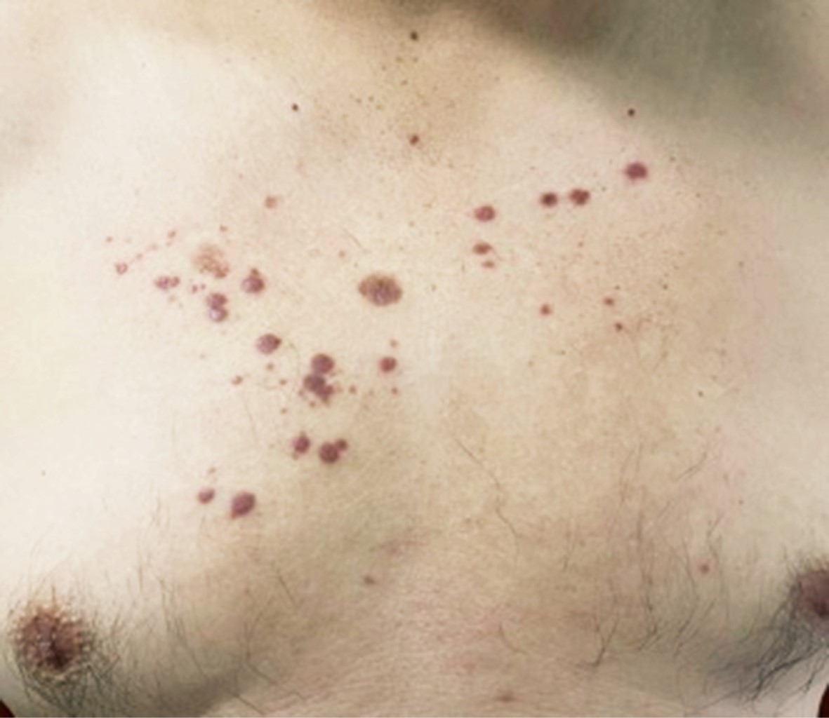 Paciente masculino de 47 años de edad, con dermatosis localizada a tórax anterior, bilateral y asimétrica, constituida por múltiples neoformaciones cupuliformes, de superficie plana, eritematosas y eritematovioláceas, de número y tamaño variable, aisladas y confluentes formando placas (Figuras 1 y 2). Evolución crónica y asintomática. Sin alteraciones en el resto de la piel y a nexos.