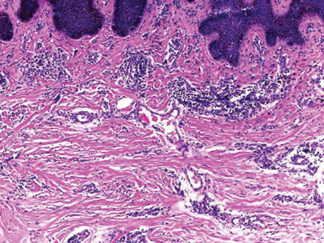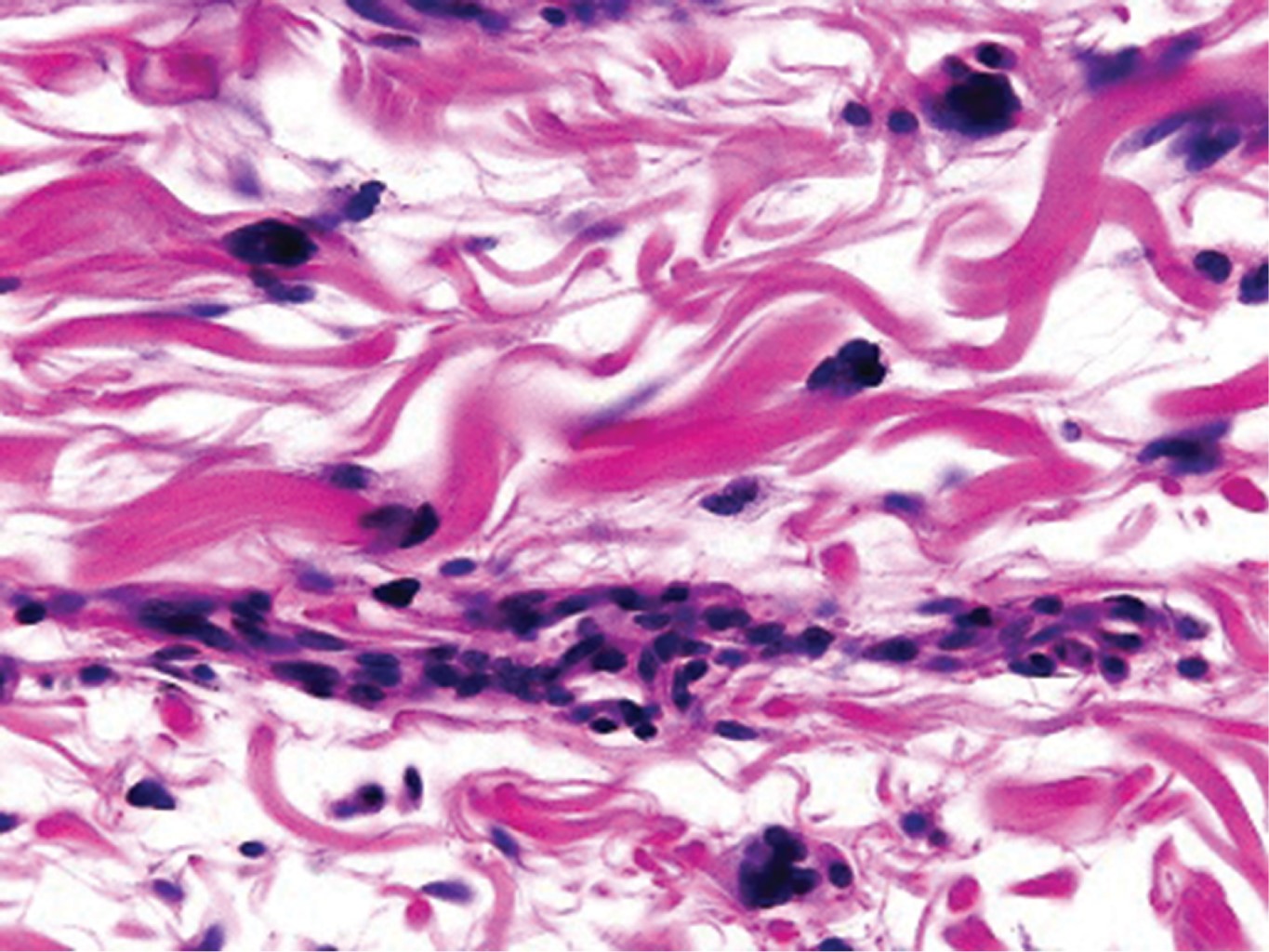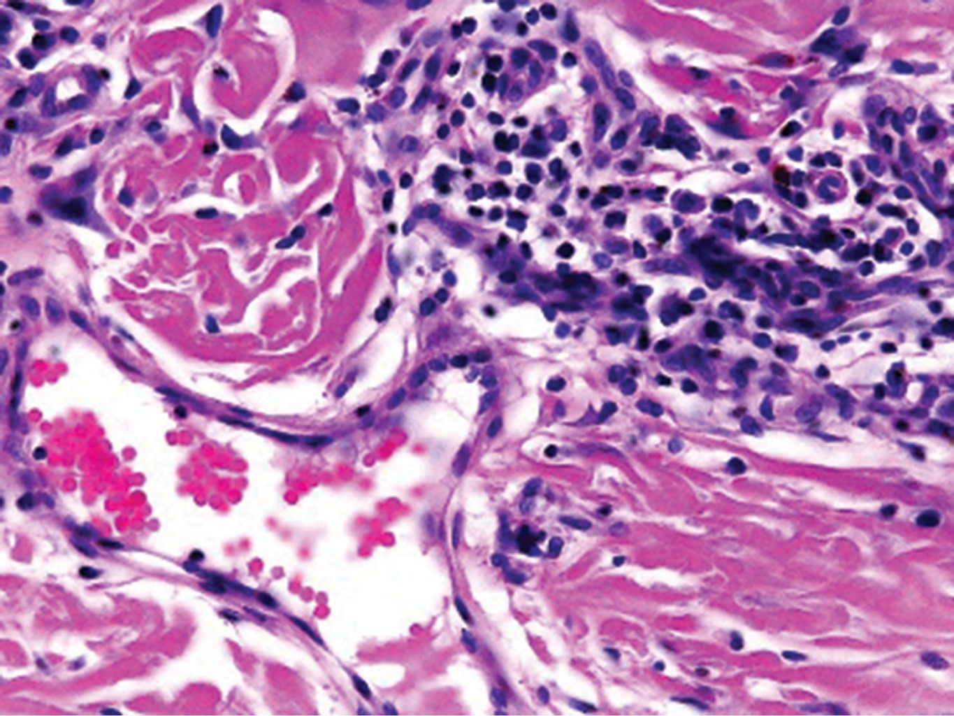 Al interrogatorio, refiere haber iniciado hace cuatro años con "lunares" de forma lenta y progresiva. Sin tratamiento previo ni antecedentes médicos de relevancia. Clínicamente se hizo el diagnóstico de sarcoma de Kaposi vs histiocitosis y se solicitaron estudios paraclínicos, que descartaron infección por VIH u otras alteraciones. El estudio histológico mostró epidermis normal y en la dermis superficial y media presencia de vasos dilatados, fibrosis y células multinucleadas basofílicas con bordes angulosos (Figuras 3, 4 y 5).