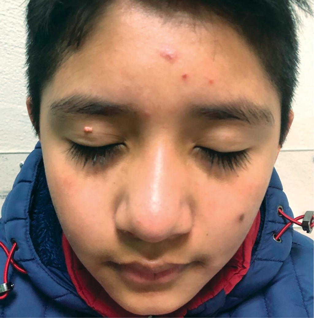 Paciente del sexo masculino de 11 años de edad, sin antecedentes familiares ni personales relevantes, quien acude por presentar dermatosis localizada a párpado superior derecho; constituida por una neoformación hemiesférica del orden de 0.5 cm, de color amarillo-rosado, de bordes bien definidos, con telangiectasias en su superficie, de aspecto lobulado (Figura 1). Con 10 años de evolución, asintomático. Sin tratamiento previo. Con la impresión clínica de tumor de anexos se realizó biopsia escisional, cuyo reporte histopatológico demostró la presencia de una neoformación exofítica, en cuya dermis se observaban cordones epiteliales constituidos principalmente por células sebáceas de características normales, las cuales en algunas zonas se encontraban delimitadas por dos o tres hileras de células basaloides. Con los hallazgos anteriores se realiza el diagnóstico histopatológico de adenoma sebáceo (Figuras 2 y 3).