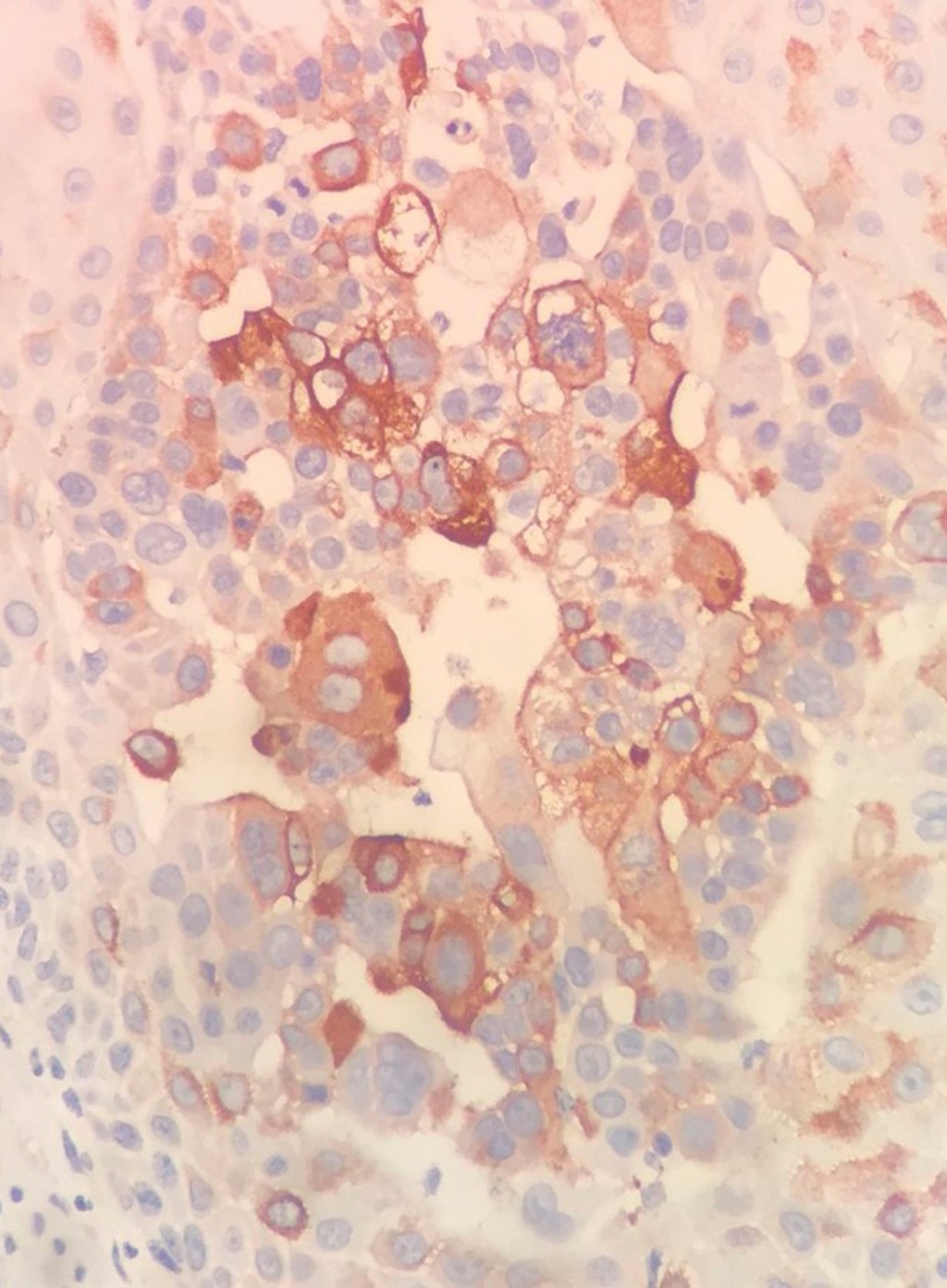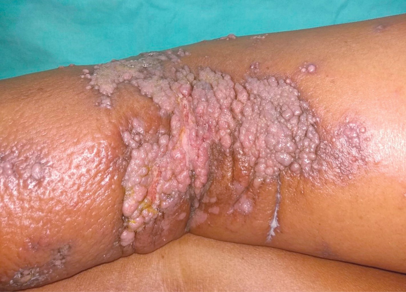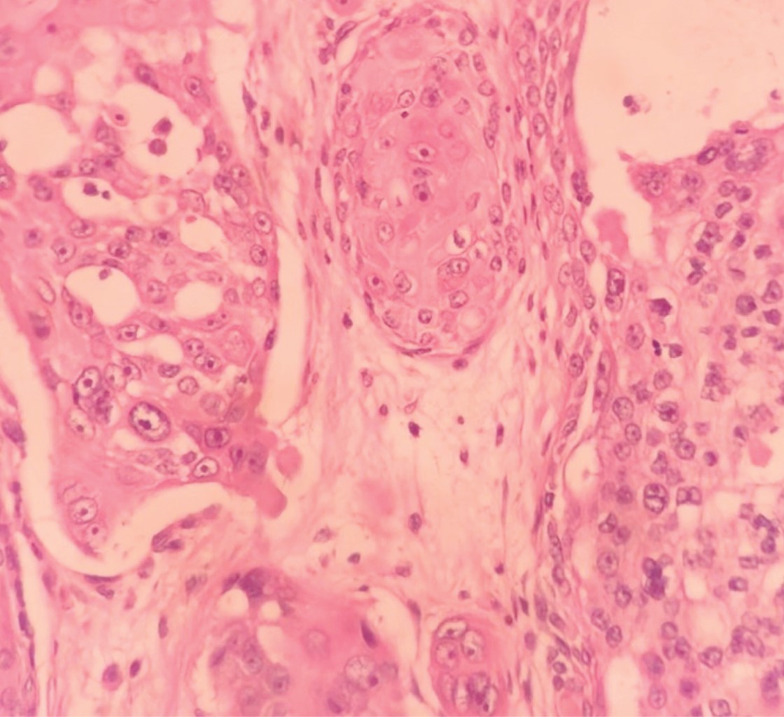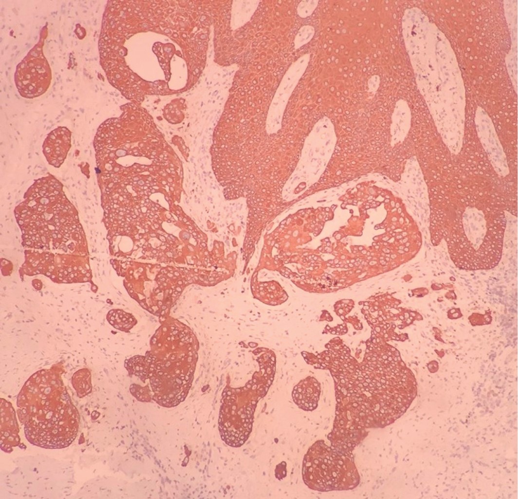 Hombre de 84 años con diagnóstico de metástasis de carcinoma epidermoide de origen primario desconocido en región inguinal izquierda, de dos años de evolución, en tratamiento paliativo con metotrexato y pregabalina durante un año, quien acude por presentar dermatosis diseminada a región inguinal izquierda y muslo izquierdo, constituida por incontables neoformaciones de diversos tamaños y formas del color de la piel, algunas amarillentas, de aspecto papular y nodular, de bordes bien definidos y en su mayoría, confluentes. En el resto de la piel se observa eritema, edema +++ y una úlcera en región inguinal. De evolución crónica y dolorosa (Figura 8). La tomografía axial computarizada (TAC) muestra adenopatías en región inguinal, bilaterales, de predominio en el lado izquierdo, y a nivel de la cadena iliaca externa derecha. Estudios de laboratorio: GGT 24 U/L, DHL 135 U/L, TGP 17 U/L, BT 0.22 mg/dL, BD 0 mg/dL, albúmina 3.3 g/dL, globulina 3.8 g/dL, Hb 12.6 g/dL, Hto 38.3%, Plt 421 × 103/µL, monocitos 16.6%, glucosa 92 mg/dL, CS 0.88 mg/dL. Debido a la rápida progresión, se inicia tratamiento con capecitabina y radioterapia (46 Gy/23 fracciones). Al notar incremento en la ulceración se suspende la quimioterapia por dos semanas para disminuir la toxicidad. Al término de la misma, se observa persistencia del edema e incremento de las lesiones. Se realiza biopsia incisional, cuyo estudio por inmunohistoquímica reporta CK7+, EMA+, P63+, CK20-, con lo cual se realiza el diagnóstico de carcinoma dependiente del folículo piloso compatible con carcinoma sebáceo (Figuras 9, 10, 11 y 12).