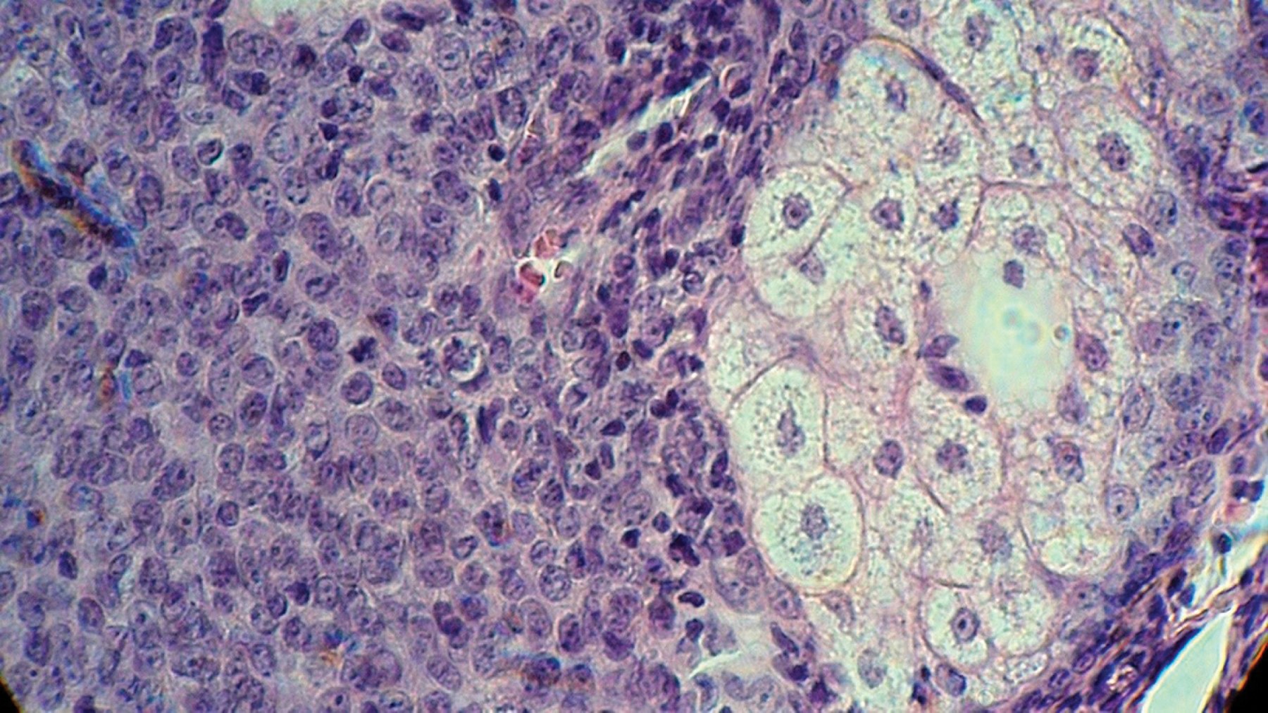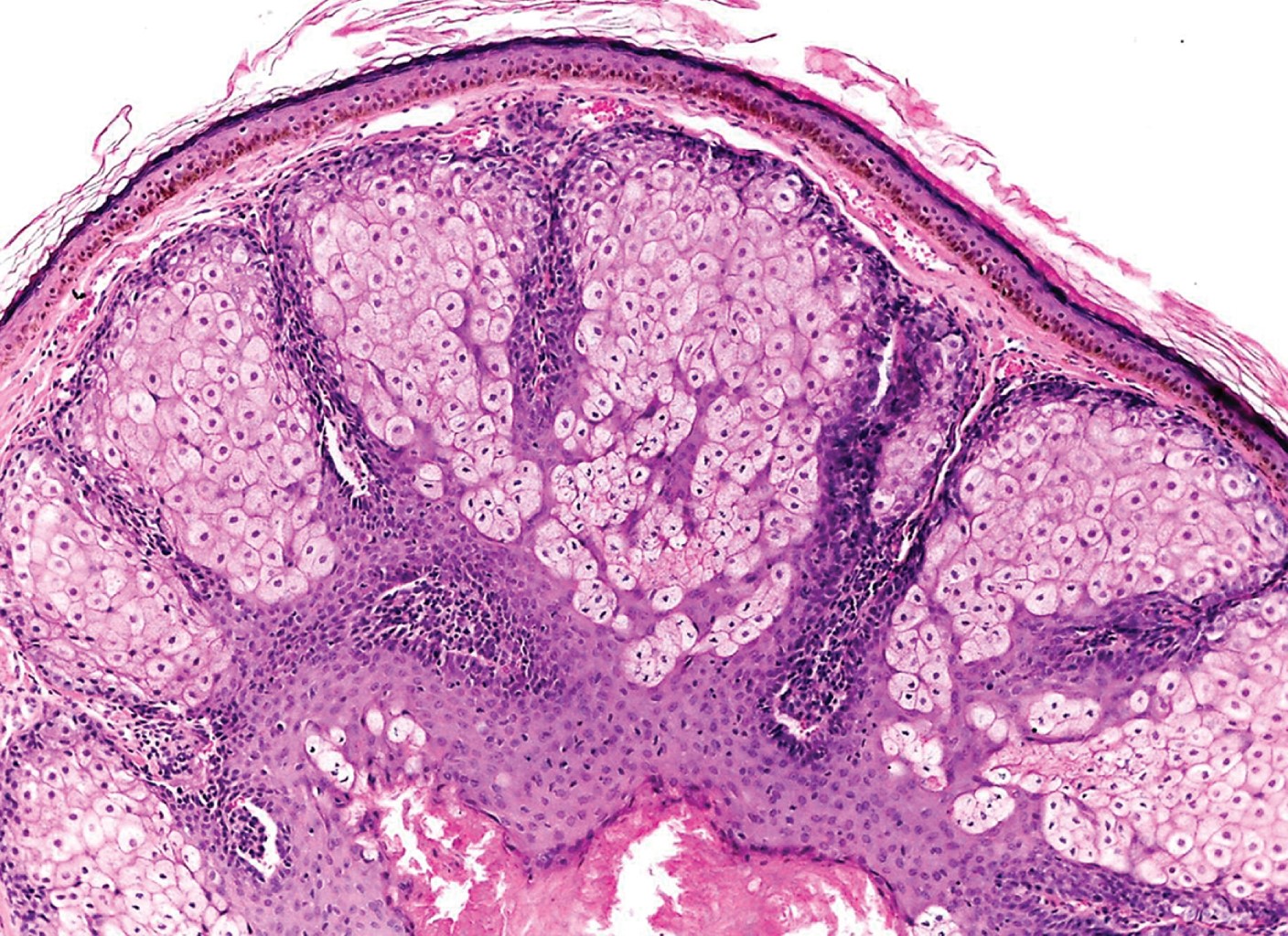 En la periferia se puede apreciar un número variable de capas de pequeñas células germinativas con núcleos vesiculares redondos u ovalados y escaso citoplasma. Este mayor número de células basaloides o germinativas permite hacer el diagnóstico diferencial con la hiperplasia sebácea, la cual contiene en su estructura máximo dos capas de dichas células. Éstas se entremezclan con las células sebáceas maduras de ubicación más central (que son mucho más grandes y tienen citoplasma espumoso, pálido y núcleos hipercromáticos centrales).
